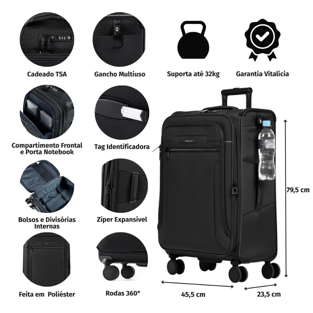 A mala Zurique é ideal para quem procura um modelo espaçoso e funcional para as viagens. Por possuir zíper expansível, é a parceria perfeita para quem costuma levar muitos itens e gosta de organização. Com seus múltiplos compartimentos, conta com porta notebook, facilitando o acesso. Desenvolvida em poliéster, material de qualidade e durável, é perfeita para quem busca uma mala resistente aos impactos das viagens. Diferenciais: - Tamanho P vai à bordo; - 4 rodas duplas com giro 360º; - Garantia: 5 anos; - Segurança: Possui cadeado TSA Flat. Disponível nas cores: preto e verde escuro. Ziper Expansível: Zíper Expansível O zíper expansível faz com que a mala de viagem ganhe alguns centímetros de espaço extra, perfeito para acomodar itens a mais. Cadeado TSA: Cadeado TSA A melhor opção para proteger sua bagagem em voos internacionais. Os cadeados TSA possuem abertura para uma chave universal, assim, a segurança do aeroporto consegue abrir o cadeado e inspecionar a bagagem/mala de viagem sem precisar estourar o cadeado e danificar sua mala. Bolso com Porta Notebook: Bolso com porta notebook Toda a segurança para o que se tem de mais importante! O notebook é um dos principais aliados de quem trabalha remotamente e quando falamos de locomoção, manter o aparelho em um compartimento adequado é essencial. Além disso, para viagens de avião o bolso para notebook traz praticidade e agilidade ao passar pela inspeção raio x, tirando a necessidade de abrir o compartimento com os demais itens pessoais. Rodas 360º: