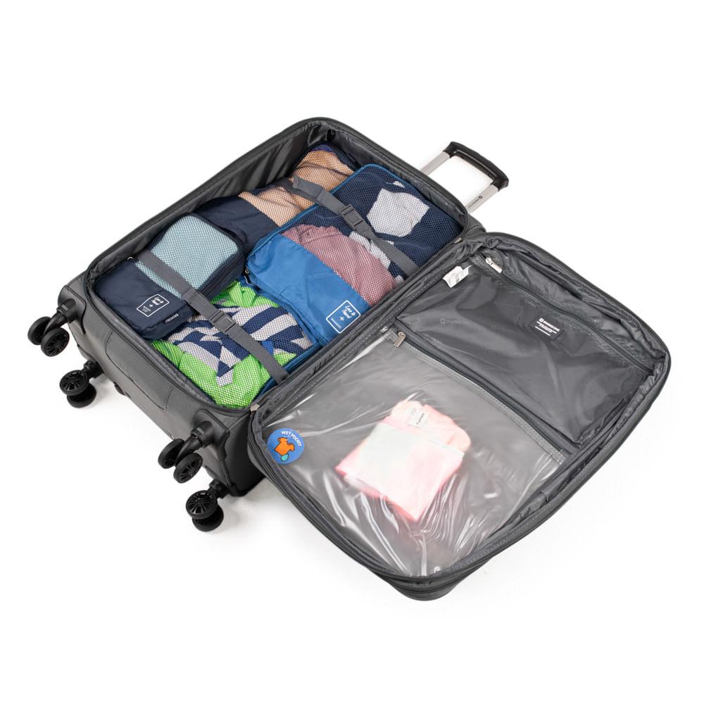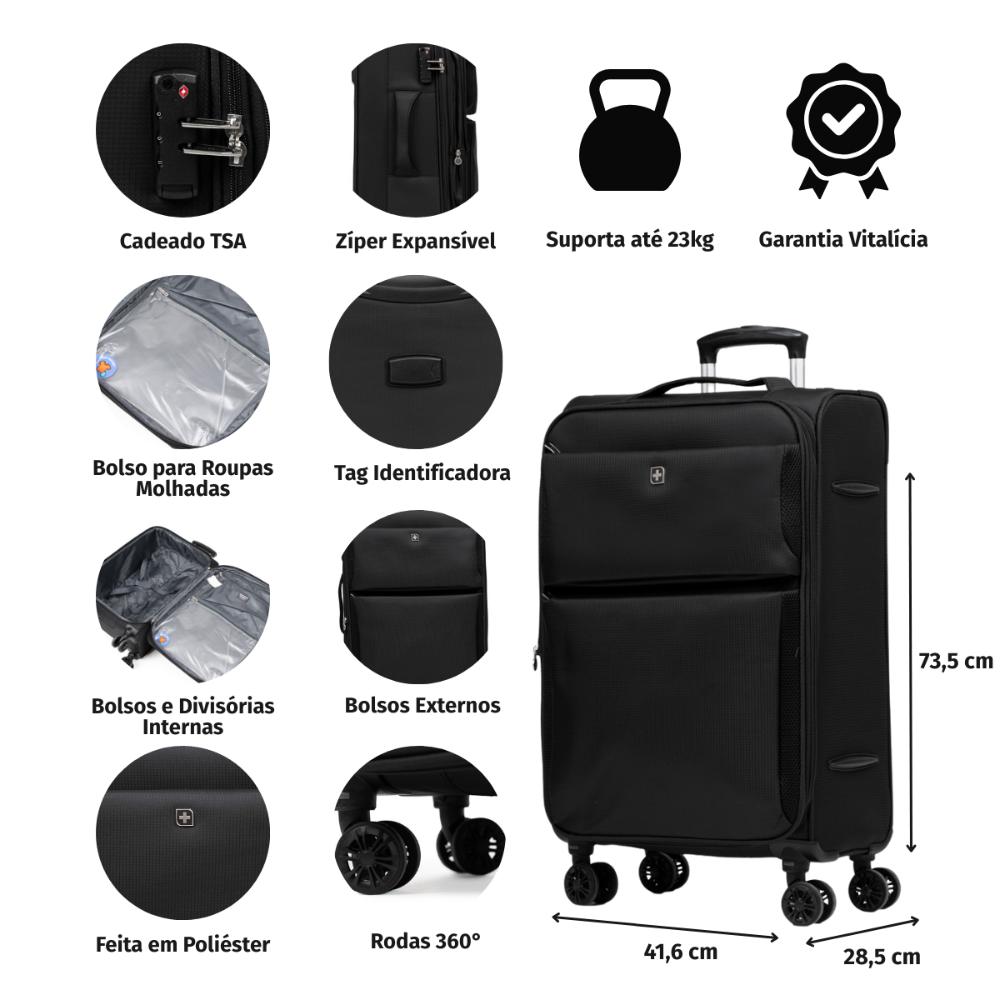 Mala Média Poliéster 4 Rodas Swiss One Verbier II Segurança, modernidade, praticidade, conforto e qualidade, a Mala Verbier média é a mala perfeita para sua viagem curta ou mais longa. Com design suíço e customizado, é feita em material super leve e resistente, garantindo proteção total aos seus pertences. Prática e confortável, ela é ideal para ser levada a qualquer lugar. Suas 4 rodas tem giro de 360º e a sua parte traseira tem espaço para encaixe nas alça de outras malas possibilitando o transporte muito mais fácil da mala. Além disso, conta ainda com dois bolsos externos para você ter fácil acesso a itens menores. O modelo é semirrígido e produzido em poliéster, material fácil de limpar. Por dentro, conta com um bolso menor e um bolso para itens molhados, ambos com fecho em zíper, além de cintas elásticas para garantir a organização da sua bagagem. DIFERENCIAIS: - Estrutura semirrígida; - Zíper Expansível - Bolsos com fecho em zíper; - Aplicação de logo personalizada; - Espaço para encaixe na alça de outras malas; - Alça de alumínio retrátil; - Alça superior e lateral; - 4 rodas com giro 360º; - Forro em nylon; - Bolso interno para pequenos pertences com fecho zíper; - Bolso interno para itens molhados com fecho em zíper; - Cinta elástica com trava; - Amplo espaço interno.