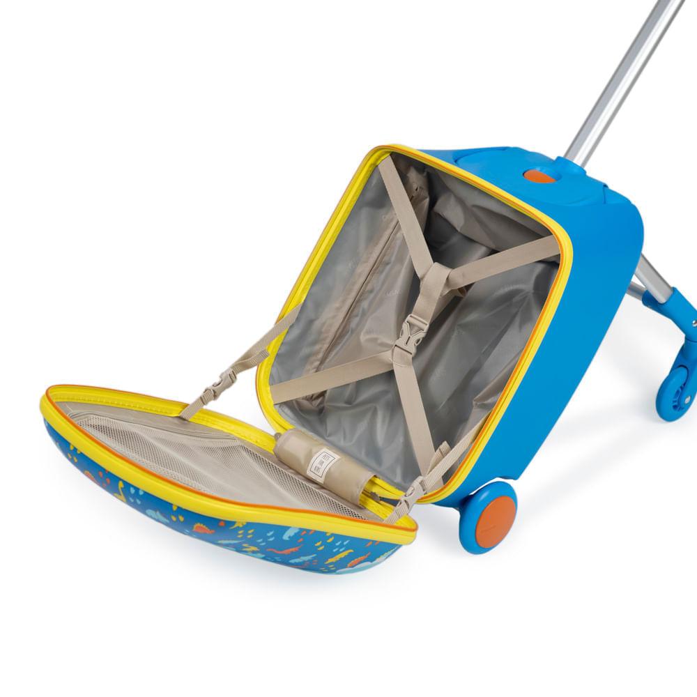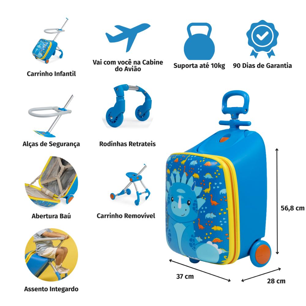 Mala de Bordo 10 Kg Pets for Kids Dino AzulMantenha as crianças entretidas e animadas em cada viagem com a Mala Pets Dino. Com design de dinossauro e cores vibrantes, essas malas não são apenas funcionais, mas também divertidas, transformando o deslocamento em uma aventura. Equipadas com 4 rodinhas giratórias e um puxador prático, garantem mobilidade e facilidade para os pequenos.Viajar nunca foi tão divertido! 2 em 1: Mala e Carrinho: 2 em 1: Mala e Carrinho para Crianças Muito mais do que uma mala comum, este modelo se transforma em um carrinho para a criança sentar e ser transportada com facilidade! Essa funcionalidade reduz o esforço dos pais e garante mais conforto e segurança para os pequenos! Rodas de Apoio Retráteis: Alça de Segurança Removível Para garantir um transporte seguro e confortável, o modelo possui rodinhas de apoio retráteis que oferecem mais estabilidade. Quando não estiverem em uso, podem ser recolhidas com um simples ajuste, facilitando o armazenamento da mala./p> Abertura Baú: Abertura Baú Uma abertura frontal que permite acessar a mala inteira, possbilitando transporte de itens de maior volume e mais organização. Alça de Segurança Removível: Alça de Segurança Removível Pensando na segurança dos pequenos, a mala acompanha uma alça de segurança destacável, permitindo que os responsáveis conduzam a criança com firmeza, evitando quedas ou acidentes.