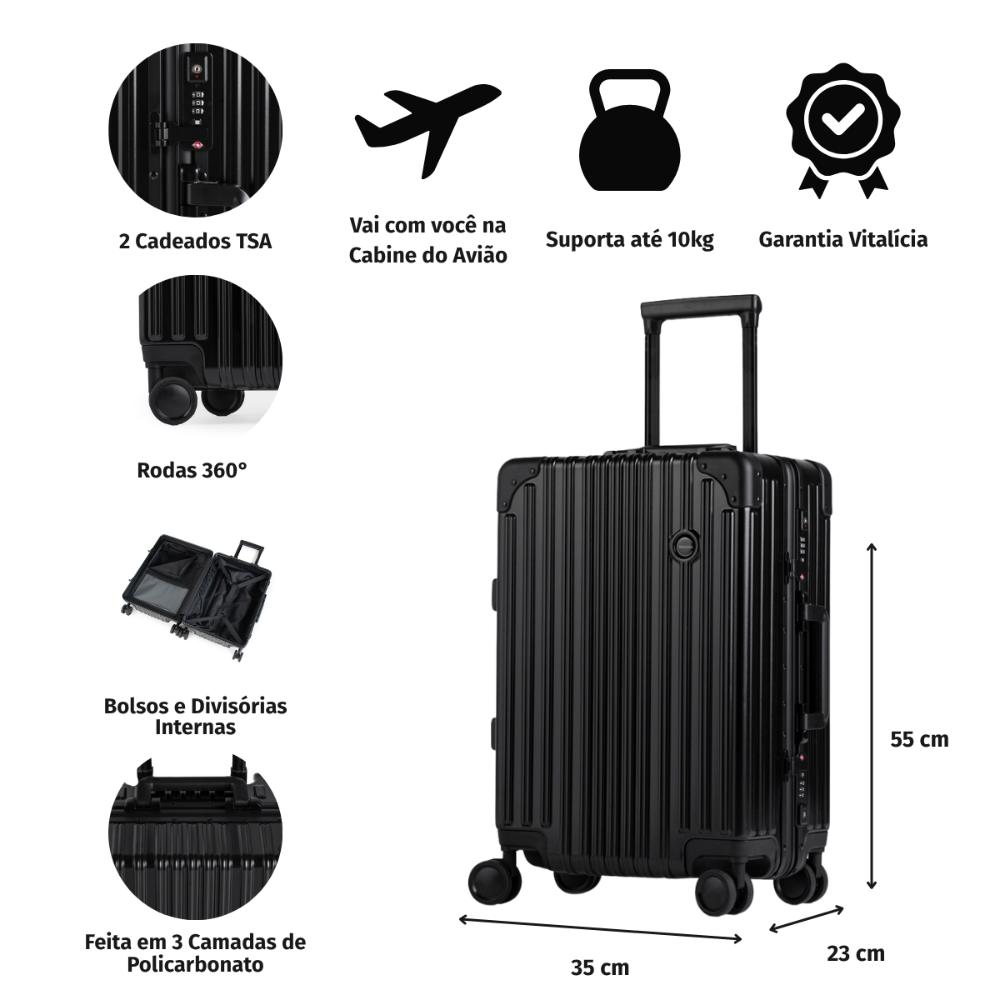 A mala de bordo Kyoto disponibiliza o que há de melhor em uma mala de viagem alta tecnologia, design e qualidade. A peça foi desenvolvida para atender todas as necessidades de quem está sempre viajando. Ela é uma mala de bordo de policarbonato, que é um material mais resistente, durável e leve. Assim, você carrega sua mala com tranquilidade e segurança. Outro ponto importante é que ela conta com 10 anos de garantia. Disponível nas cores: Preta e Prata Principais atributos: -Rodas de qualidade: A mala Kyoto têm quatro rodas duplas que giram 360º, proporcionando mais comodidade ao transportá-la. -Organização: Com divisória interna, também destacamos os bolsos e cinta elástica no seu interior, que ajudam a organizar toda a bagagem. Tamanhos Disponíveis P: 35 X 22 X 55 CM M: 43 X 26 X 67 CM G: 50 X 31 X 77 CM Bagaggio responde -Posso levar ela comigo dentro do avião? Sim, a mala de bordo Kyoto atende as normas de tamanho para ser transportada com você durante a viagem. -Ela possui cadeado? Ela vem com cadeado TSA, que dão ainda mais segurança a quem a usa. -Esse produto possui garantia? Sim! A mala Kyoto possui 10 anos de garantia. DIFERENCIAIS: - 3 camadas de policarbonato - Cadeado TSA - Rodas duplas com giro 360º - Alça de alumínio resistente - Alças de mão - Compartimentos internos, para ajudar a organização da bagagem Cadeado TSA: Cadeado TSA A melhor opção para proteger sua bagagem em voos internacionais. Os cadeados TSA possuem abertura para uma chave universal, assim, a segurança do aeroporto consegue abrir o cadeado e inspecionar a bagagem/mala de viagem s
