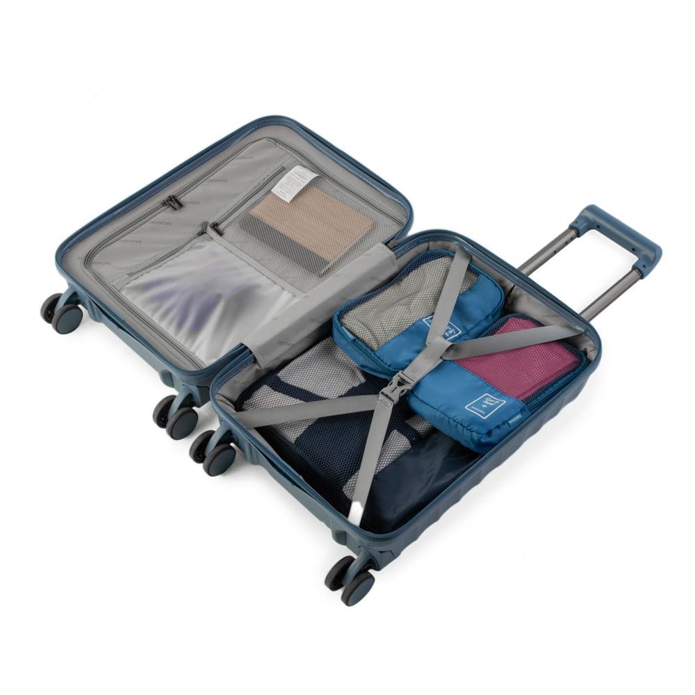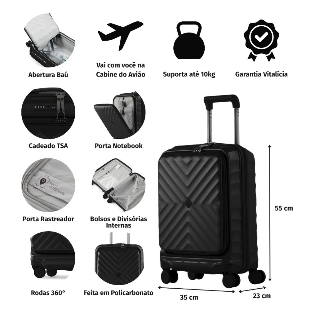 Cadeado TSA: Cadeado TSA A melhor opção para proteger sua bagagem em voos internacionais. Os cadeados TSA possuem abertura para uma chave universal, assim, a segurança do aeroporto consegue abrir o cadeado e inspecionar a bagagem sem precisar estourar o cadeado e danificar sua mala. Bolso com Porta Notebook: Bolso com porta notebook Para viagens de avião o bolso para notebook traz praticidade e agilidade ao passar pela inspeção raio x, tirando a necessidade de abrir o compartimento com os demais itens pessoais. Rodas 360º: Rodas 360° As rodas com giro 360º facilitam o deslocamento da mala, fazendo com que ela possa ser conduzida em qualquer direção, sem precisar incliná-la e sem fazer esforço. Amplo espaço interno: Amplo compartimento Interno A mala conta com divisórias simples e elásticos com trava, ideais para manter seus itens no lugar. Além disso, ela possui amplo espaço interno. Abertura Baú: Abertura Baú Uma abertura frontal que permite acessar a mala inteira, possbilitando transporte de itens de maior volume e mais organização.