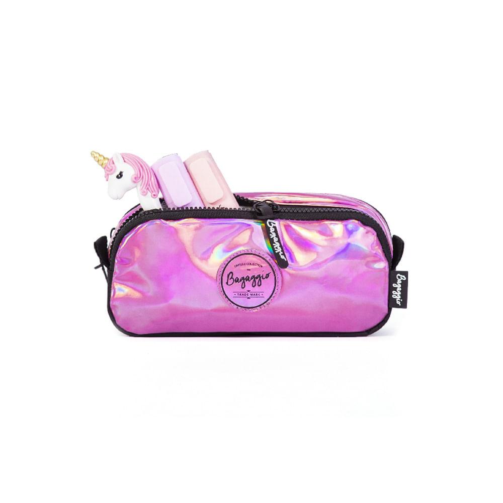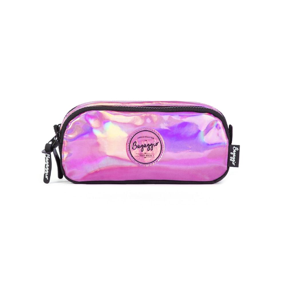 Estojo Escolar Feminino Duplo Holografico Rosa