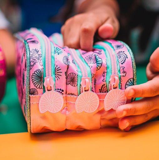 O estojo Disney Ariel completa o kit escolar da sua pequena e deixa a hora do estudo muito mais divertida. Feito em poliéster, material bastante resistente e durável, tem o selo do INMETRO certificando a qualidade e segurança do produto. Com design exclusivo da Bagaggio, seus puxadores são de metal e personalizados para deixar o produto ainda mais incrível. Possui três compartimentos e amplo espaço interno, ideal para quem tem muitos lápis, canetas e acessórios para organizar.