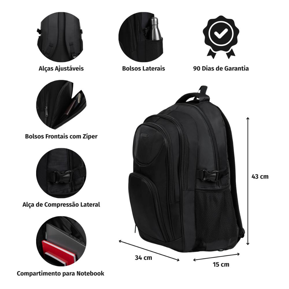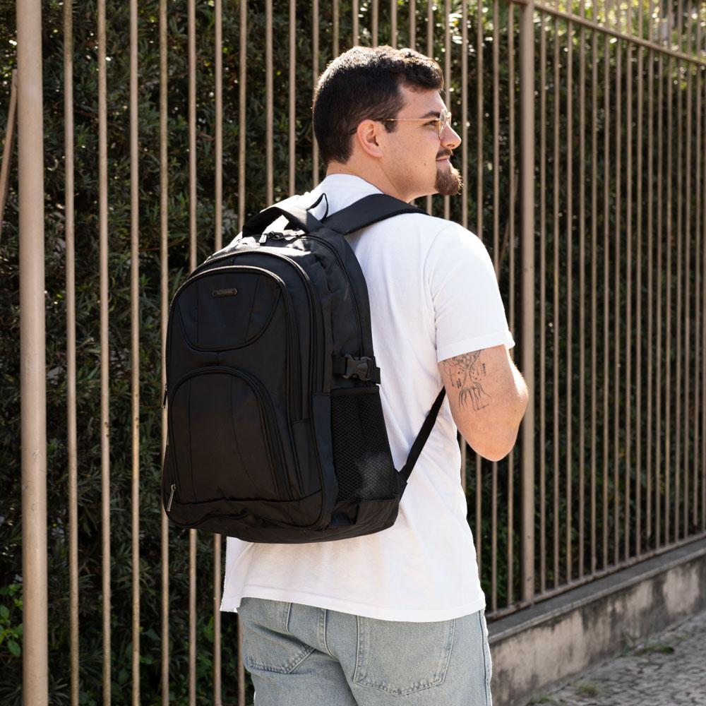 Mochila Para Notebook Elevate PretoA Mochila Grande para Notebook Elevate Preta é a combinação perfeita de elegância, funcionalidade e conforto para o dia a dia. Com um design executivo e sofisticado, ela é ideal para quem precisa de praticidade e segurança no transporte de equipamentos e pertences. Fabricada em poliéster resistente, possui um compartimento especial para notebook, garantindo proteção extra para o seu dispositivo. Sua capacidade de 23L e dimensões de 45 x 34 x 15 cm oferecem um espaço interno bem distribuído para manter tudo organizado. Além disso, sua estrutura leve e ergonômica proporciona mais conforto no uso diário, seja no trabalho, em viagens ou em compromissos acadêmicos. Com garantia de 90 dias, a Mochila Elevate é a escolha ideal para quem busca um acessório versátil, durável e cheio de estilo.Marca: BagaggioCor: Preto Faixa Etária: AdultoDimensões: 45 x 34 x 15 cmCapacidade (L): 23LAmplo espaço interno: Amplo compartimento Interno A bolsa possui amplo espaço interno, ideal para guardar todos os seus itens.: Material: Poliéster