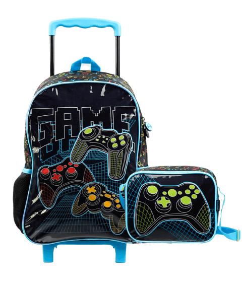 Kit Mochila de Rodinhas e Lancheira Térmica Video Game Preta