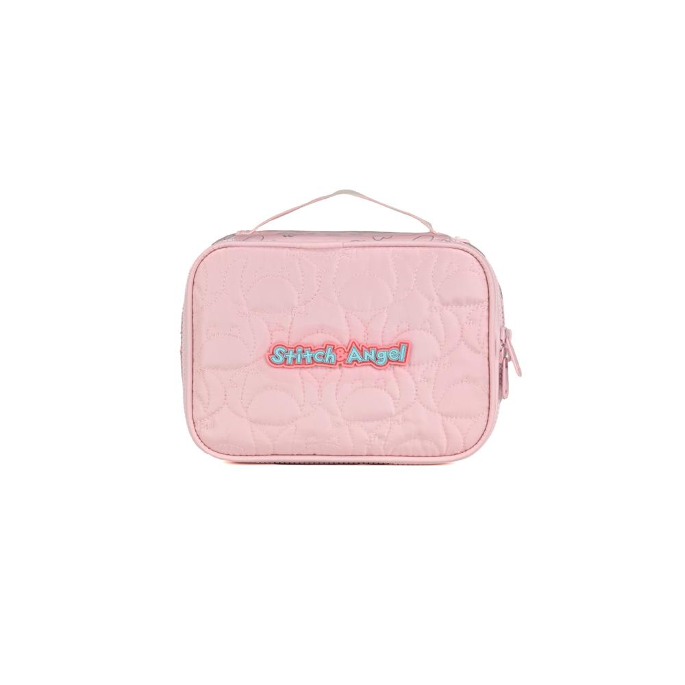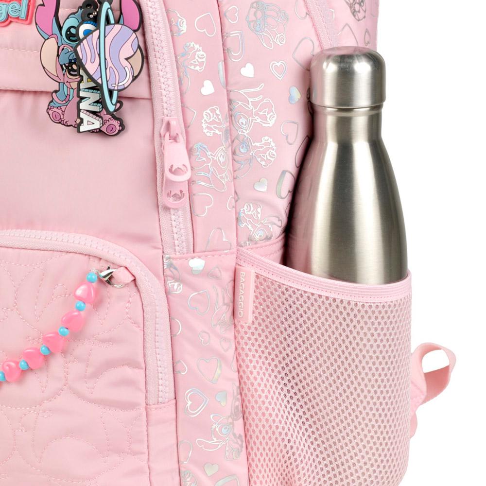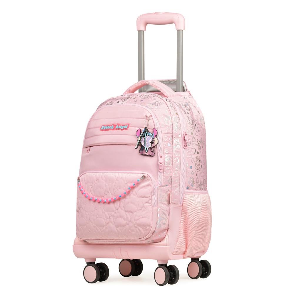 Kit Mochila de 4 rodinhas + Estojo Escolar Feminino Grande Stitch & Angel Rosa Claro