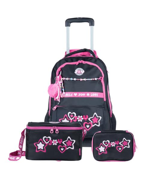Kit Mochila de Rodinha Feminina + Lancheira Térmica + Estojo Box BG Joy Preto