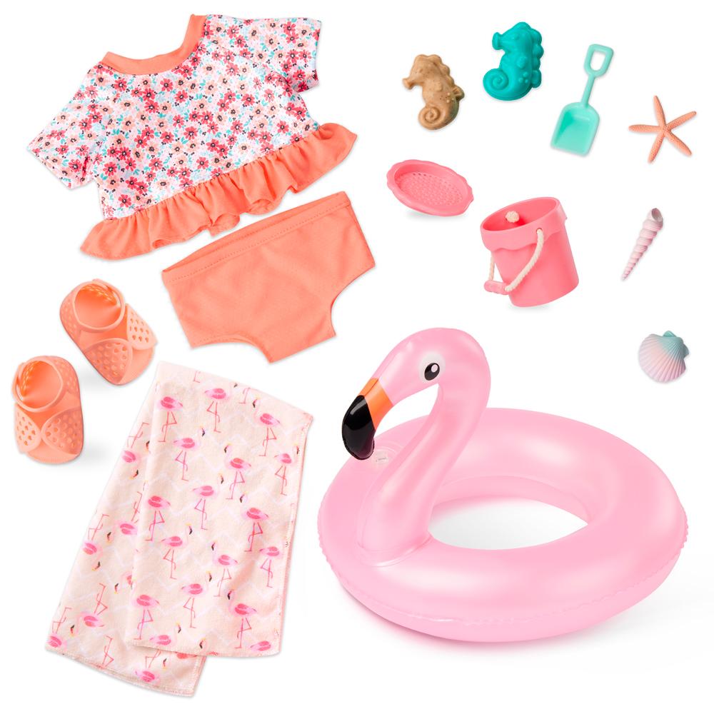 A boneca Our Generation Gabriela está pronta para viver grandes aventuras com muito estilo! Com 46 cm de altura, ela encanta com seus olhos castanho-escuros que abrem e fecham e cabelos ondulados que podem ser penteados de várias maneiras. Seu corpo é macio e abraçável, com braços e pernas articulados que permitem diversas poses durante a brincadeira. Gabriela acompanha dois looks completos: um maiô estampado para os momentos à beira-mar e um vestido de verão superfofo para passeios ao sol. Além disso, ela vem com acessórios como óculos de sol florais, calcinha, sandálias, toalha, boia inflável de flamingo, balde, pá, peneira, molde de areia e três conchinhas, que tornam a brincadeira ainda mais divertida. As roupas têm fechos práticos, ideais para as crianças explorarem sua criatividade e autonomia ao trocar os visuais da boneca. Compatível com a maioria das bonecas, roupas e acessórios de 46 cm.