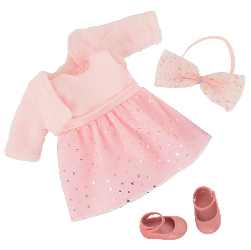 A Boneca Our Generation Miranda chegou para brilhar em qualquer ocasião! Com 46 centímetros de altura, cabelos loiros lisos e olhos azuis expressivos, Miranda é puro charme. Seu look é digno de uma estrela: ela veste um delicado vestido rosa com detalhes de estrelas douradas, uma jaqueta de pelúcia super fofa e macia, uma faixa de cabelo com laço e sapatos combinando — um visual perfeito para festas, passeios e muitas aventuras encantadas!Miranda faz parte da linha Our Generation, conhecida por bonecas de alta qualidade, com roupas modernas e acessórios cheios de estilo. Seu corpo é macio e suas articulações móveis tornam a brincadeira ainda mais realista. Ideal para crianças que adoram moda, criatividade e histórias cheias de imaginação, a boneca Miranda também é compatível com todos os acessórios e roupas da linha Our Generation.