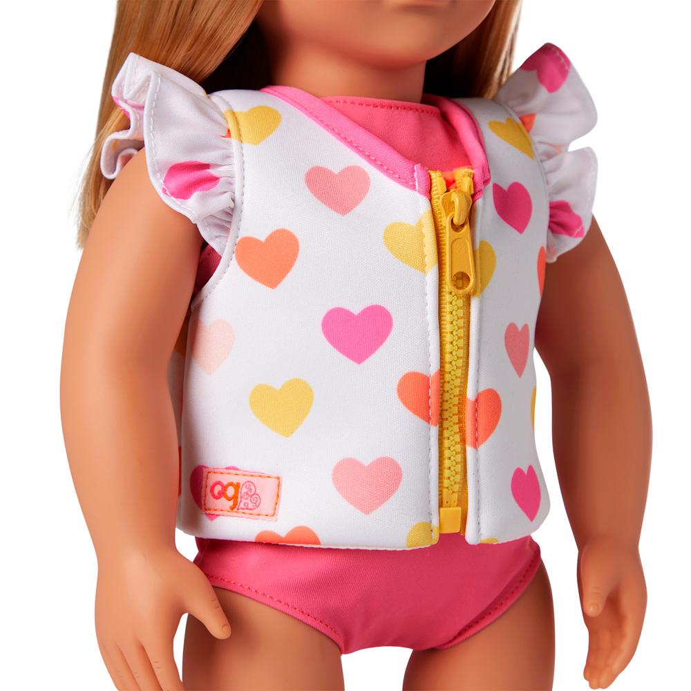 Prepare a sua boneca Our Generation para dias de sol e aventuras à beira da piscina com o Conjunto de Roupa Maiô e Acessórios! Este conjunto exclusivo para bonecas de 46 cm traz um maiô rosa com detalhes delicados em babados, combinando perfeitamente com a parte de baixo estilosa e o colete salva-vidas com estampa colorida de corações, garantindo diversão e segurança nas brincadeiras imaginativas. Completo com óculos de natação e sapatos transparentes para água, o conjunto oferece um visual moderno e pronto para mergulhar em histórias cheias de criatividade e aventura.Compatível com a maioria das bonecas Our Generation de 46 cm e seus acessórios, este kit é perfeito para quem deseja expandir o guarda-roupa da boneca com estilo e versatilidade. O Conjunto de Roupa Our Generation Maiô e Acessórios é a escolha certa para transformar cada dia em uma verdadeira festa na piscina!