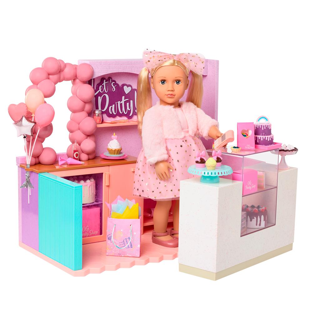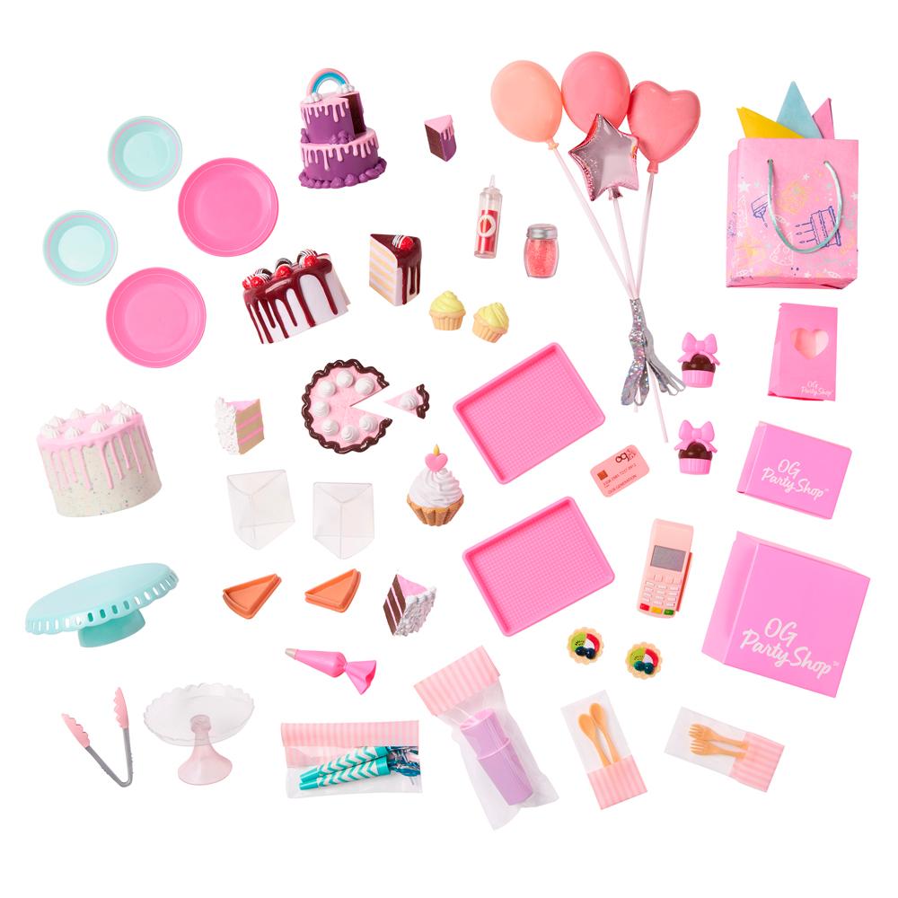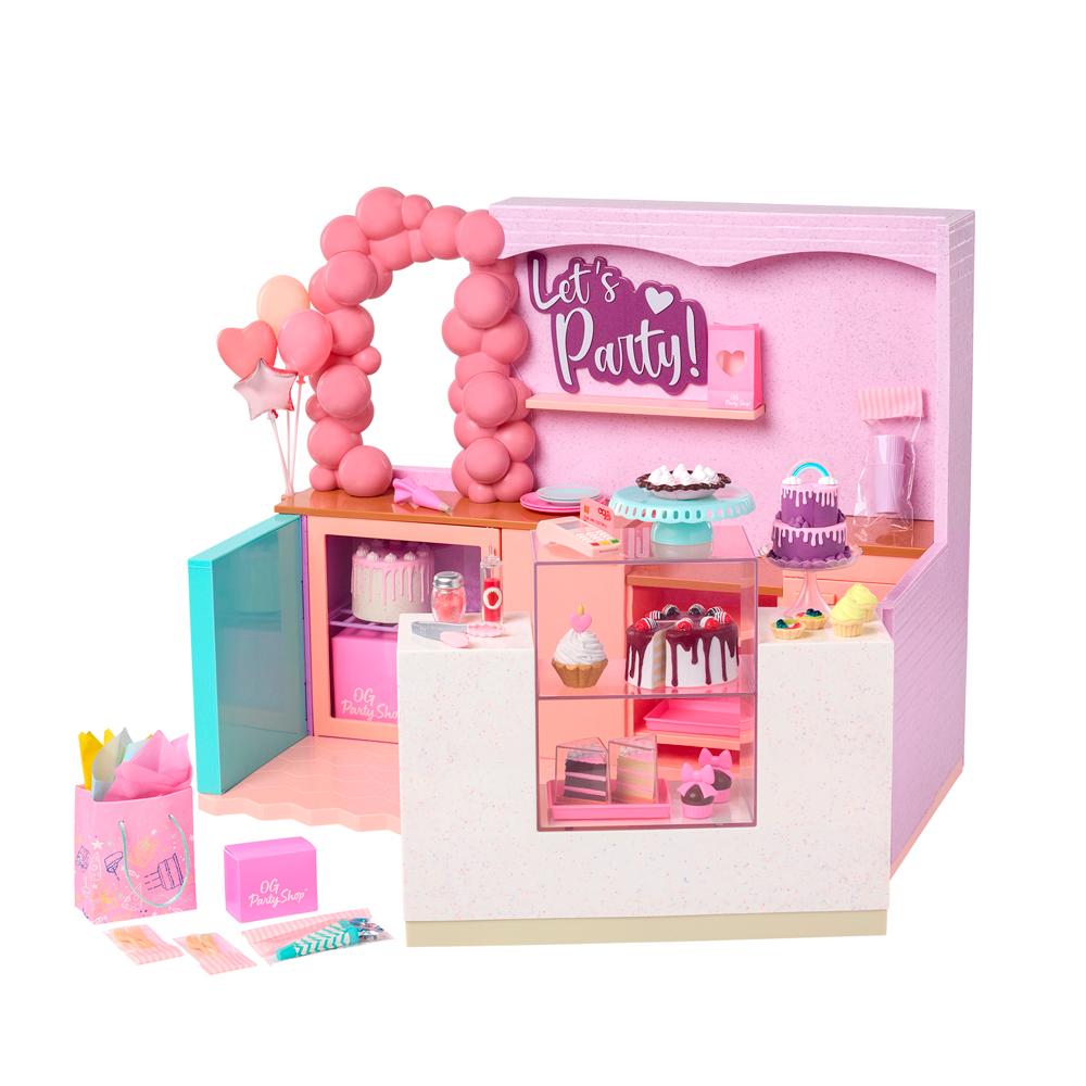 A Loja de Festas Our Generation transforma qualquer momento em uma celebração inesquecível! Com cores vibrantes e um charmoso arco de balões rosa, este playset para bonecas de 46 cm oferece tudo para criar festas incríveis, com mais de 15 deliciosos itens de sobremesa, incluindo cupcakes, tortas e um bolo com cheiro real de chocolate. A mini geladeira, prateleira e balcão retrátil garantem um espaço perfeito para expor e servir as guloseimas. Completo com saco de confeitar, xarope de morango, caixas para levar e um terminal de pagamento com cartão, o playset traz diversão e realismo para as brincadeiras. Ideal para estimular a imaginação e a criatividade, a Loja de Festas Our Generation é o presente perfeito para pequenos anfitriões apaixonados por festas e doces.