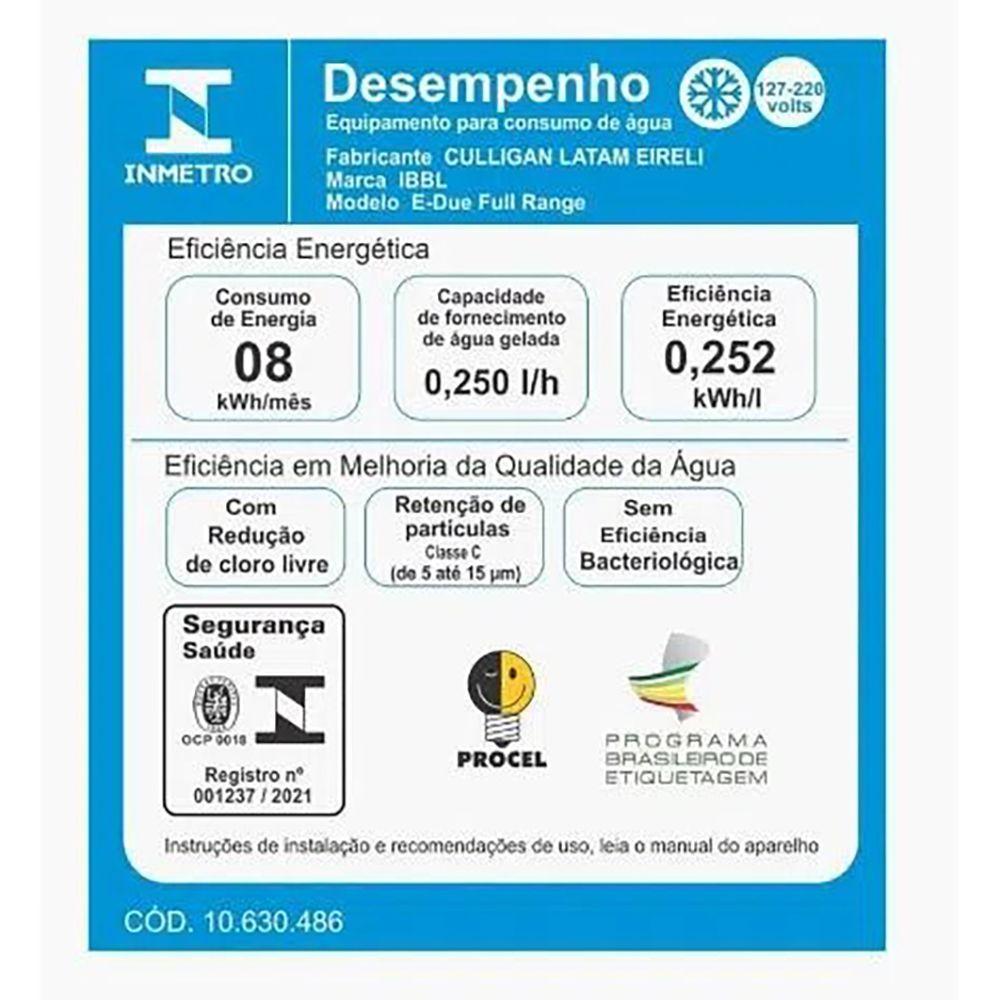 Purificador de Água Ibbl E-Due Branco Bivolt 79013001Invista na saúde da sua família com os novos purificadores E-Due. Essa linha proporciona filtragem e refrigeração e atende às necessidades diárias de até 4 pessoas. É muito simples fazer a troca do seu refil através do sistema "Girou Trocou". Possui visor do refil, desta forma fica fácil de você saber a hora de trocar. E seu refil é Bacteriostático: impedindo a proliferação das bactérias do tipo Pseudomonas aeruginosa que, em pessoas com o sistema imunológico enfraquecido, pode gerar infecções.Você pode escolher entre água gelada, natural ou misturada. E ainda tem uma água livre de impurezas, pois o filtro retém as micropartículas da água, como barro, areia ou ferrugem.Seu uso é muito versátil, pois tem capacidade de abastecer recipientes maiores como jarras ou garrafas com sua bica articulável e grande vazão de água. Sem contar que ainda pode ser instalado sobre bancada ou fixado na parede. O purificador conta com bandeja pingadeira de fácil remoção para higienização.Sua extrutura é feita com gabinete possuindo proteção UV, com cores que combinam com a sua cozinhae que são muito mais duráveis. Seus pés anti derrapantes ele garante melhor aderência e estabilidade. Ele ainda pode ser desmontado para hignienização, tornando-o muito mais prático.Cuide da sua família! Adquira agora o Purificador de Água E-Due.Especificações Técnicas:- Marca: Ibbl- Modelo: 79013001- Voltagem: Bivolt- Cor: Branco- Nacionalidade: Nacional Origem 5 Grupo 000- Volume Interno do Reservatório: 800ml- Capacidade de Fornecimento de Água Gelada: 250ml/h- Temperatura de Água: 10 °C- Vazão Máxima Recomendada (L/h) 60- Uso Residencial: Sim- Uso Comercial: Não- Pressão de Trabalho (m.c.a. ou kPa): 5 a 50 m.c.a. ou 49,03 a 490,33 kPa- Tipo de Refrigeração: Placa Eletrônica- Tipo de Filtro: C+3- Eficiência na Retenção de Partículas (μm): C ≥ 5 até < 15- Eficiência de Redução de Cloro Livre: Aprovado- Bacteriostático: Aprovado- Eficiência Bacteriológica: Não se Aplica- Reduz a Acidez da água: Não se Aplica- Vida Útil do Refil: 3000 litros ou até 6 meses- Grau de Proteção: IPX0- Amperagem (A): 0,9 | 0,6- Potência (W): 63- Frequência - Mercado Nacional: (Hz) 50/60- Consumo de Energia (kWh/mês): 8- Eficiência Energética (kW/L): 0,252- Dimensões do Produto (LxAxP): 35,7 x 27 x 32,1 cm- Dimensões da Embalagem (LxAxP) 37,4 x 28,5 x 34,1 cm- Peso Líquido: 3,6 kg- Peso Bruto: 4,35 kg- Garantia: 12 meses