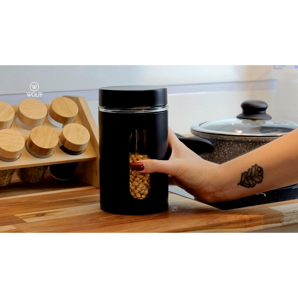 Porta Mantimento Wolff de Vidro e Metal com Visor 900mlO Porta Mantimento de Vidro e Metal com Visor da Wolff é uma adição prática e elegante para a sua cozinha, oferecendo uma solução eficiente para o armazenamento de alimentos.Construção DurávelFabricado com materiais de alta qualidade, incluindo vidro e metal, o porta mantimento é resistente e durável, garantindo a segurança e a preservação dos alimentos.Visor TransparenteO visor transparente permite visualizar facilmente o conteúdo do porta mantimento, facilitando a identificação dos alimentos armazenados sem a necessidade de abri-lo.Capacidade AdequadaCom capacidade de 900ml, é ideal para armazenar uma variedade de alimentos, como grãos, cereais, açúcar, café, entre outros ingredientes essenciais da sua despensa.Design EleganteO design elegante e moderno do porta mantimento adiciona um toque de sofisticação à sua cozinha, complementando diversos estilos de decoração.Fechamento SeguroO fechamento hermético mantém os alimentos frescos por mais tempo, preservando seu sabor e qualidade.Mantenha seus alimentos frescos, organizados e acessíveis com o Porta Mantimento de Vidro e Metal com Visor da Wolff.Wolff. A melhor experiência em receber, servir e decorar!Contém: 1 Porta MantimentoLava Louça: NãoMicroondas: NãoForno: NãoFogão: NãoFreezer: NãoMedidas Produto: Altura 17,50cm x Largura 10,00cm x Comprimento 10,00cmPeso: 0,58KgCor: PretoMaterial: VidroLavar com detergente neutro, esponja macia e secar imediatamente.