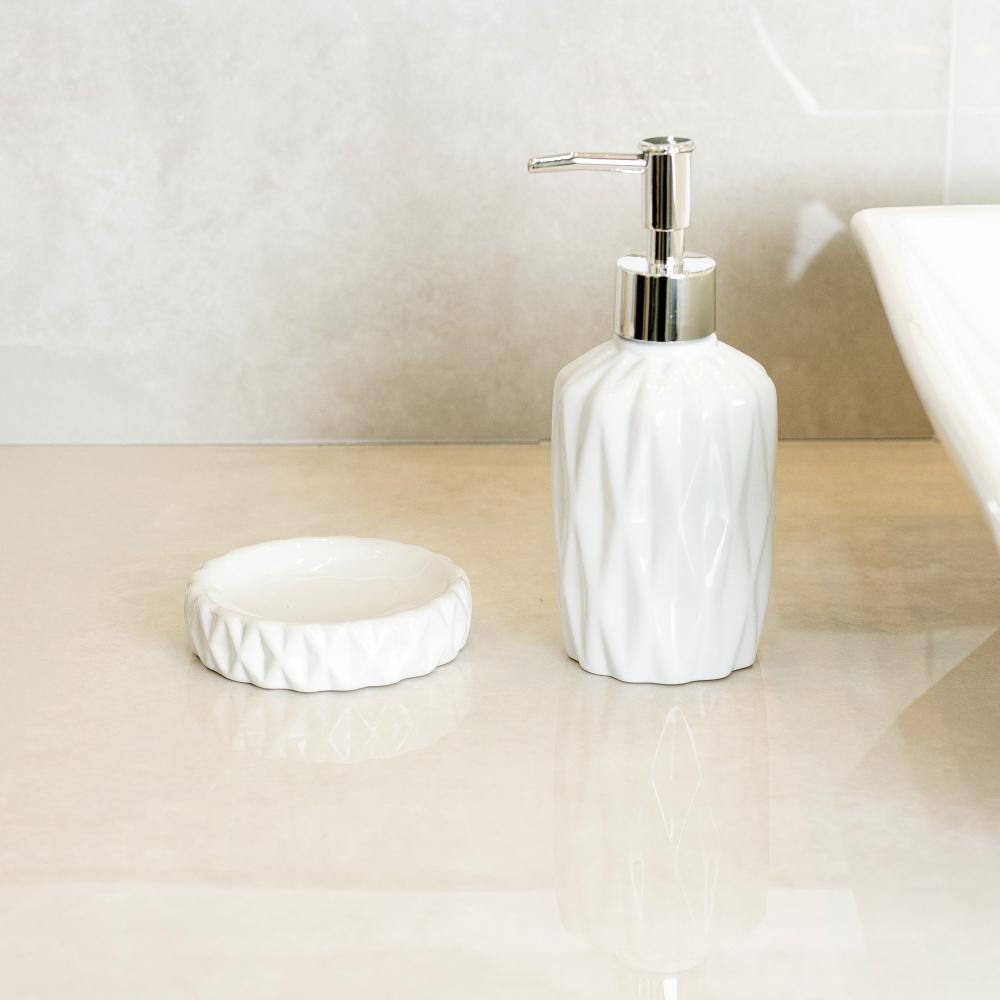 2 Peças para Banheiro Lyor de Cerâmica BrancoO Conjunto 2 Peças para Banheiro de Cerâmica Diamond Branco da Lyor é uma escolha elegante e funcional para aprimorar a decoração do seu banheiro.Design SofisticadoCom um padrão em forma de diamante em relevo, este conjunto adiciona um toque de sofisticação e charme à sua bancada de banheiro.Durabilidade e QualidadeFabricado em cerâmica de alta qualidade, este conjunto é resistente e durável, garantindo uso prolongado.Conjunto CompletoInclui uma saboneteira e um porta-escovas de dentes, oferecendo soluções práticas para manter seus itens de banho organizados e acessíveis.Eleve o estilo do seu banheiro com o Conjunto 2 Peças para Banheiro de Cerâmica Diamond Branco da Lyor, unindo elegância e praticidade.Lyor - Sua Casa Completa.Contém: 1 Porta Sabonete Líquido 8cm x 7cm x 17,5cm1 Saboneteira 10cm x 10cm x 2,5cmLava Louça: NãoMicroondas: NãoForno: NãoFogão: NãoFreezer: NãoMedidas Produto: Altura 13,00cm x Largura 10,50cm x Comprimento 10,50cmPeso: 0,61KgCor: PrataMaterial: CerâmicaLavar com detergente neutro, esponja macia e secar imediatamente.