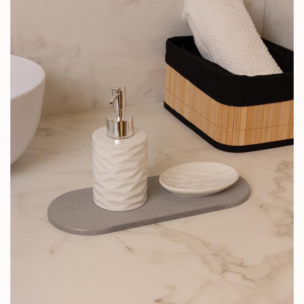 Bandeja Oval Absorvente para Pia 28cm Cinza DiatomitaOrganize sua pia com um design moderno e a eficiência da pedra diatomita. Esta bandeja oval na cor cinza é a solução ideal para quem busca uma peça funcional para manter a bancada seca e em ordem.Organize sua pia com um design moderno e a eficiência da pedra diatomita. Esta bandeja oval na cor cinza é a solução ideal para quem busca uma peça funcional para manter a bancada seca e em ordem.Absorção superiorO material de diatomita é extremamente eficaz em absorver a água, evitando poças e facilitando a limpeza.Formato oval que se destacaUma alternativa charmosa ao design retangular, que adiciona um toque de suavidade à organização.Cor cinza, moderna e fácil de combinarUm tom neutro que se harmoniza perfeitamente com pias de inox e bancadas de pedra.Ideal para banheiro ou cozinhaSua versatilidade permite o uso como base para sabonetes no banheiro ou para detergente na cozinha.LyorSoluções completas para o seu lar.Contém: 1 BandejaMedidas Produto: Altura 0,90cm x Largura 11,00cm x Comprimento 28,00cmPeso: 0,23KgLimpar com Pano Úmido