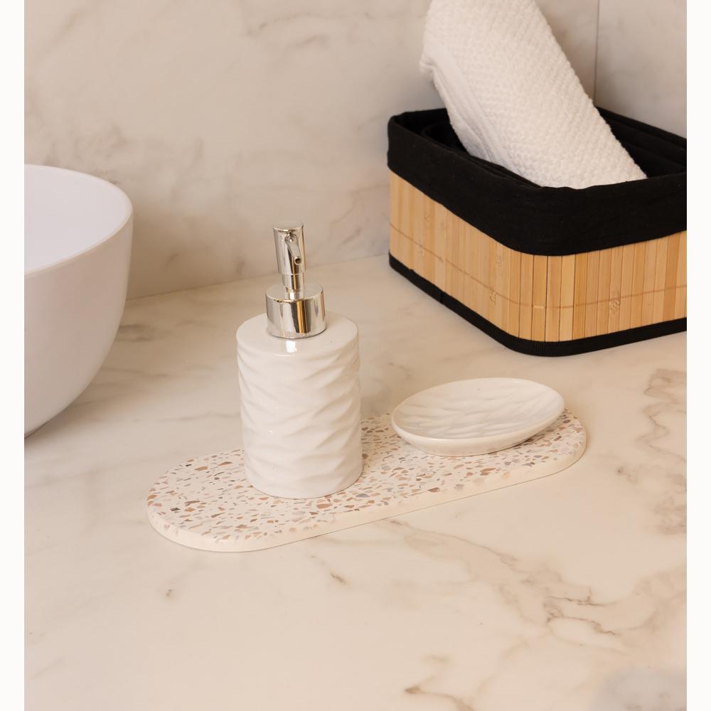 Bandeja Oval Absorvente para Pia 28cm Granilite DiatomitaA funcionalidade da pedra diatomita encontra a estética de uma das maiores tendências da decoração. A Bandeja Oval com acabamento granilite é a peça perfeita para uma pia moderna, organizada e sempre seca.A funcionalidade da pedra diatomita encontra a estética de uma das maiores tendências da decoração. A Bandeja Oval com acabamento granilite é a peça perfeita para uma pia moderna, organizada e sempre seca.Absorve água instantaneamenteA superfície da bandeja suga os respingos e a umidade em segundos, mantendo a área da pia impecável.Acabamento granilite, um toque de designA estampa que remete ao granilite confere um visual moderno e texturizado à peça.Formato oval suaveAs linhas curvas são um contraponto interessante à textura da estampa, criando uma peça equilibrada.Solução inovadora para a casaÉ um produto que une uma tecnologia surpreendente (diatomita) a um design muito procurado, com grande apelo de venda.LyorSoluções completas para o seu lar.Contém: 1 BandejaMedidas Produto: Altura 0,90cm x Largura 11,00cm x Comprimento 28,00cmPeso: 0,23KgLimpar com Pano Úmido