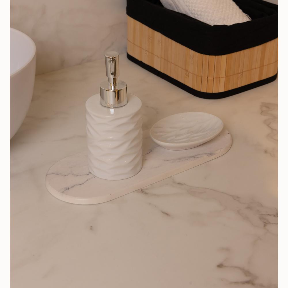 Bandeja Oval Absorvente para Pia 28cm Marmorizado DiatomitaUma base de apoio com design orgânico e a incrível capacidade de absorção da pedra diatomita. A Bandeja Oval com acabamento marmorizado é perfeita para organizar a pia com um toque de fluidez e elegância.Uma base de apoio com design orgânico e a incrível capacidade de absorção da pedra diatomita. A Bandeja Oval com acabamento marmorizado é perfeita para organizar a pia com um toque de fluidez e elegância.Secagem ultra-rápida e naturalA superfície porosa da diatomita suga a água em segundos, mantendo a bancada livre de umidade.Design oval e charmosoAs linhas curvas do formato oval criam um visual mais suave e delicado na decoração da cozinha ou do banheiro.Acabamento clássico de mármoreO padrão marmorizado confere um ar de bom gosto à peça, transformando um item funcional em decorativo.Superfície naturalmente antiderrapanteA textura da pedra oferece uma base firme e segura para apoiar frascos de vidro e outros itens.LyorSoluções completas para o seu lar.Contém: 1 BandejaLava Louça: NãoMicroondas: NãoForno: NãoFogão: NãoFreezer: NãoMedidas Produto: Altura 0,90cm x Largura 11,00cm x Comprimento 28,00cmPeso: 0,23KgCor: CinzaMaterial: Diatomita Limpar com Pano Úmido