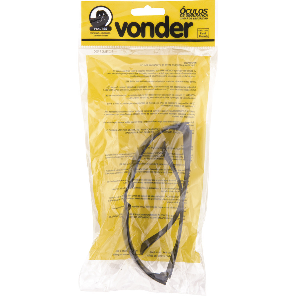 Conteúdo da embalagem1 Óculos de segurançaAplicações e dicas de usoIndicado para proteção dos olhos do usuário contra partículas volantes e para ambientes com alta luminosidadeDestaques e diferenciaisPossui lentes em policarbonato com tratamento anti-risco e proteção contra raios UVA 60% e UVB 95%, proporcionando maior durabilidade e ótima resistência. Produto em conformidade com a norma ANSI Z87.1. DETALHES TÉCNICOS Modelo do óculos de segurança: Maltês Número do Certificado de Aprovação - CA: 15002 Material da lente do óculos de segurança: Policarbonato Cor da lente do óculos de segurança: Fumê (cinza) Material da haste do óculos de segurança: Policarbonato