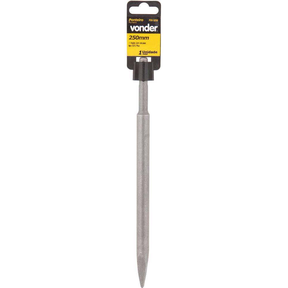 Conteúdo da embalagem1 PonteiroAplicações e dicas de usoUtilizado em martelete tipo SDS PLUS para romper concreto, alvenaria, pedras, entre outros DETALHES TÉCNICOS Comprimento total do ponteiro: 250 mm Perfil do corpo do ponteiro: Redondo