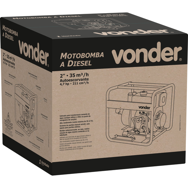 Conteúdo da embalagem1 Motobomba a diesel, acompanha: 1 chave de fenda intercambiável (ponta fenda simples e ponta fenda cruzada 5 mm x 55 mm), 1 chave soquete 8 mm/10 mm e 2 chaves fixas 12 mm x 14 mm e 17 mm x 19 mmAplicações e dicas de usoIndicada para remoção de água limpa de caixas d'água, poços, cisternas, entre outros. Também pode ser utilizada em ambientes alagados, como garagens e porões, com restrição para água com muito barro ou excesso de areia, pedras ou pedriscos. Equipamento sem óleo, necessário abastecer antes do funcionamento. Óleo indicado 15W40. Não acompanha bateria.Destaques e diferenciaisPossui alto rendimento (vazão máxima de 36 m³/h), possui sistema de partida manual retrátil com opção para partida elétrica, faltando apenas acoplar a bateria (não acompanha). Recomendamos instalar a bateria para facilitar a partida e diminuir o esforço do operador. Código da bateria 80.55.020.000. Bomba autoescorvante, ou seja, consegue fazer a sucção da água mesmo contendo ar dentro da tubulação, permitindo eliminar a válvula de fundo de poço. DETALHES TÉCNICOS Potência 219 cm³ (cc) - 5 hp Tipo de motor a combustão: 4 tempos Combustível: Diesel Vazão máxima da motobomba: 36 m³/hora Sucção máxima da motobomba: 8,0 m Recalque máximo da motobomba: 26,0 m Consumo aproximado do motor da motobomba: 1 litro/hora Capacidade do tanque de combustível da motobomba: 2,4 litros Capacidade de óleo no cárter: 0,8 litro Diâmetro do tubo de entrada da motobomba: 50 mm Diâmetro do tubo de saída da motobomba: 50 mm Sistema de partida: Manual retrátil e elétrica Sistema de ignição: Ignição por compressão Temperatura do ambiente de trabalho: 0 a +40 °C Dimensões da motobomba (C x L x A): 527 mm x 455 mm x 507 mm Peso aproximado: 41 kg Prazo de garantia: 6 meses
