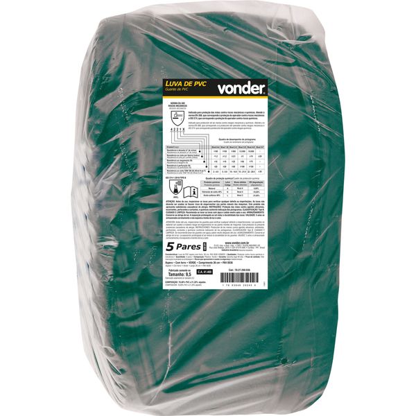 Conteúdo da Embalagem:5 Pares de luvas de PVCDescrição:Luva de PVC áspera com forro, 46 cm, PAV 0046 VONDERAplicações e dicas de uso:Indicada para proteção das mãos contra riscos mecânicos e químicosDestaques e diferenciais:Atende à norma EN-388, que corresponde à proteção do operador contra riscos mecânicos, e ISO 374, que corresponde à proteção do operador contra riscos químicosCaracterísticas Técnicas:Tamanho da palma da luva PVC: 9,5 Comprimento total da luva: 46 cm Cor da luva: Verde Tipo do forro da luva: Algodão Tipo da palma da luva: AsperaGarantia legal: 90 dias