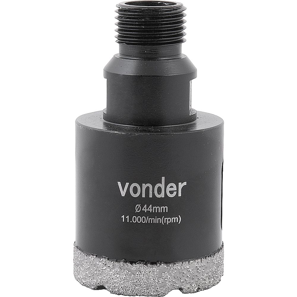 Ref. Fornecedor: 3617200044Marca: VonderConteúdo Embalagem:1 Serra copoDestaques e diferenciais:Corte a seco. Permite a realização de furos com grandes diâmetros em tempo reduzidoAplicações e dicas de uso:Serra copo diamantada para uso em telhas, tijolos, cerâmicas, azulejos, granito, mármore. Indicada para uso em esmerilhadeira com rosca interna M14 e rosca externa 1/2" BSP para máquinas estacionárias em marmorariaCaracterísticas Técnicas:Diâmetro da serra copo: 44 mm Altura útil aproximada da serra copo: 47 mm Comprimento total: 80,0 Diâmetro e tipo da rosca: M14 Rotação máxima (rpm): 11000 /min