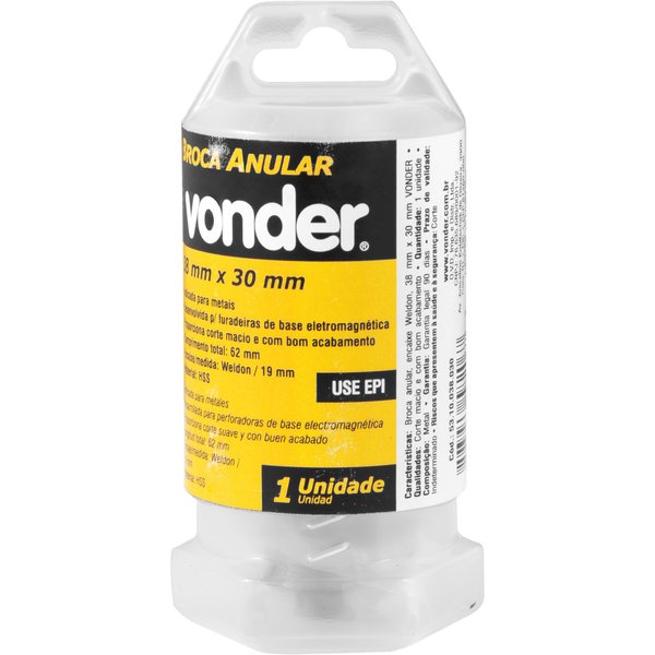 Ref. Fornecedor 5310038030Marca: VonderConteúdo da Embalagem:1 Broca anular. Acompanha: 1 pino guia/extrator de 6,35 mm x 77 mmDestaques e diferenciais:Proporciona corte macio e com bom acabamento, o encaixe padrão Weldon (19 mm) garante perfeita fixação e segurançaAplicações e dicas de uso:Indicada para metais, desenvolvida para furadeiras de base magnéticaCaracterísticas Técnicas:Diâmetro da broca (mm): 38,00 mm Comprimento total: 62,0 Comprimento útil da broca: 30,0 mm Tipo do encaixe: Weldon (19 mm)
