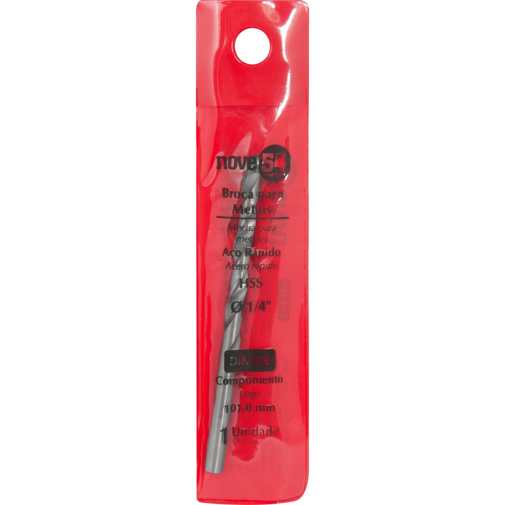 Marca: Nove54Conteúdo da Embalagem:1 Broca de aço rápido, encartelada, DIN 338Destaques e diferenciais:Produzida em aço rápido, proporcionando maior durabilidadeAplicações e dicas de uso:Indicada para uso em metais ferrosos e não ferrosos. Para aumentar a vida útil da broca, recomenda-se utilizar fluído/óleo de corte para lubrificação e resfriamento. Uso leve.Características Técnicas:Diâmetro da broca (pol): 0.1/4 " Comprimento total da broca : 101,0 mm Norma.: DIN 338