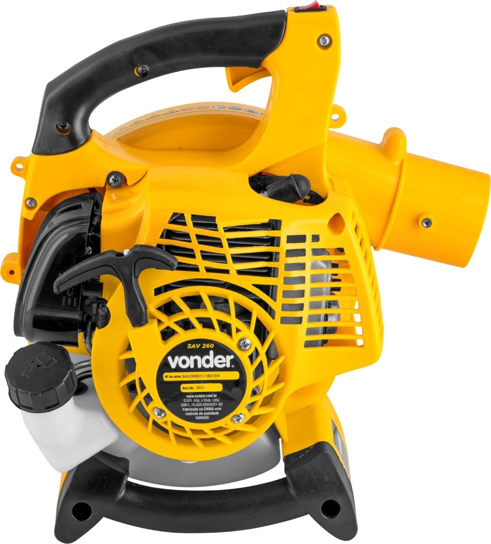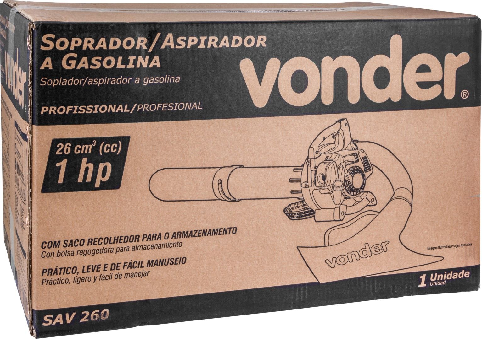 Marca: VonderConteúdo da embalagem: 1 Soprador/aspirador. Acompanha: 2 tubos para sucção, 1 saco coletor, 1 reservatório para mistura de combustível, 2 tubos para soprador, 1 tubo para saco coletor e 1 chave de vela.Destaques e diferenciais:Em um mesmo aparelho une soprador e aspirador, oferecendo mais agilidade para as limpezas. Prático, leve e de fácil manuseio. Possui saco recolhedor para o armazenamento de folhas e restos de grama.Dicas de uso:Indicado para a limpeza de folhas, grama cortada e resíduos. Pode ser utilizado em condomínios, clubes, ginásios esportivos, indústrias, prefeituras, entre outros.Detalhes Técnicos:Capacidade do tanque do soprador: 400 ml Cilindrada: 26 cm³ Combustível: Gasolina comum com óleo 2 tempos Linha: Profissional Motor: 26,0 cm³ (cc) Potência: 1 cv/hp Potência: 0,74 kW Sistema de partida: Manual retrátil Tipo de ignição: Eletrônica Tipo do motor do soprador: 2 tempos Tipo do soprador: Portátil Velocidade máxima de saída do ar: 245 km/h Volume de saída de ar: 10,2 m³/min