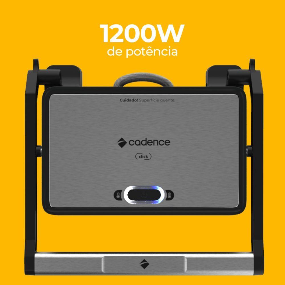 Grill elétrico Cadence Click GRL200 1200W com placas antiaderentes e capacidade para 2 porçõesO Grill elétrico Cadence GRL200, nas cores preto e inox, é a solução prática e eficiente para preparar lanches, sanduíches e pães de forma rápida, com potência de 1200W. Suas placas antiaderentes garantem cozimento uniforme e facilitam a limpeza, tornando o preparo mais confortável e seguro para o dia a dia.O equipamento possui indicador luminoso de funcionamento e pré-aquecimento, alça fria ao toque e base antiderrapante, oferecendo segurança durante todo o uso. Compacto e leve, ele se adapta facilmente a qualquer cozinha, seja em apartamentos, casas ou espaços pequenos, garantindo versatilidade e economia de espaço.Ideal para café da manhã, lanches rápidos ou refeições práticas, o Grill GRL200 permite que você prepare porções para duas pessoas com conforto e eficiência. Além disso, seu design moderno em preto e inox agrega estilo e sofisticação à bancada da cozinha, tornando-o um eletrodoméstico funcional e elegante.Um equipamento completo que combina praticidade, desempenho e qualidade, transformando o preparo de lanches em uma experiência simples, rápida e segura.Especificações técnicasMarca: CadenceModelo: GRL200Voltagem: 127VCor: Preto e CinzaPotência: 1200WCapacidade: 2 sanduíches por vezTemperatura Máxima: 200°CPlacas Antiaderentes: SimControle de Temperatura Ajustável: NãoIndicador Luminoso de Funcionamento e Pré-aquecimento: SimAbertura de 180° para Uso como Chapa Dupla: NãoSistema de Aquecimento Rápido: NãoMaterial da Estrutura: Plástico e Aço InoxAlça Fria ao Toque: SimBase Antiderrapante: SimDimensões do produto: 27 L x 76 A x 22,7 P cmDimensões Embalado: 27,8 L x 30,2 A x 11,3 P cm Peso Liquido: 1,3kgPeso Embalado: 1,6kgGarantia: 12 meses