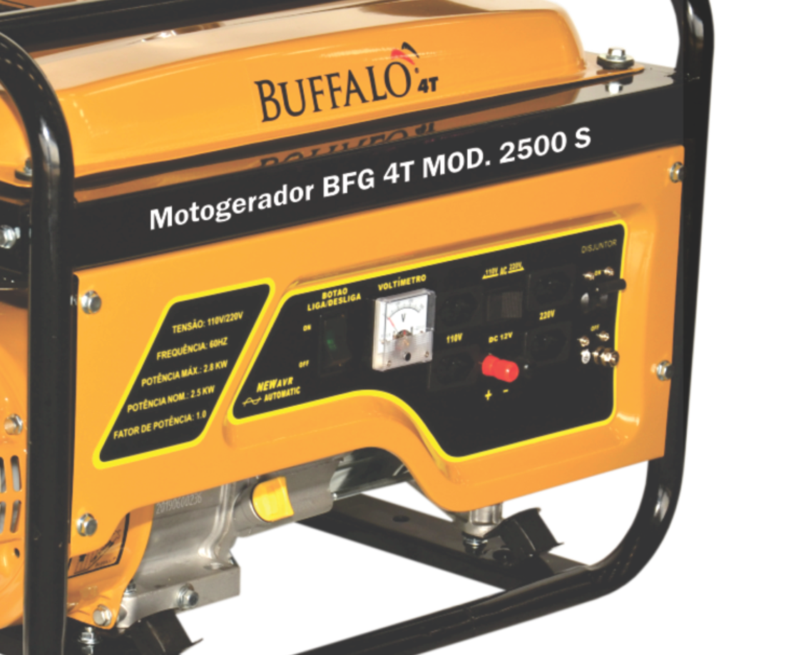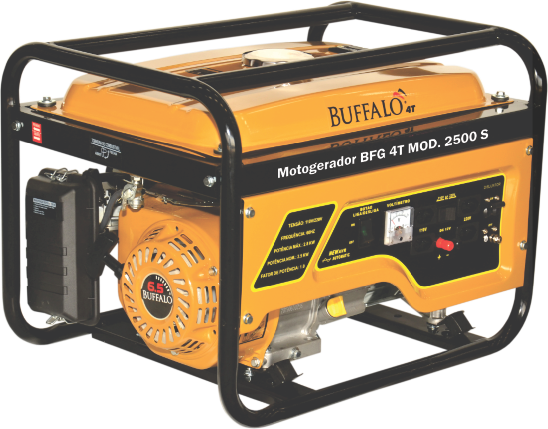 Os Geradores Buffalo Proporcionam Segurança De Energia Onde Você Precisar, Tenha Essa Força. O Gerador Bfg 2500, É Equipado Com Motor 6,5 Cv Gasolina, Fornece 2,5 Kw De Potência Nominal, Possui Chave Seletora De Tensão (110V Ou 220V), É Ideal Para Ser Usado Em Casa, No Trabalho, Construção Civil, Em Momentos De Lazer Ou No Campo. Código:60637 Tipo:Gasolina 4T - Refrigerado a Ar Potência do Motor (Cv)(KW/Rpm):7,0 (5,2/3600) Cilindrada (cm³):208 Óleo Lubrificante (L/tipo):0,6 / SAE 20W50 Combustível (L/tipo):12,5 / Gasolina Comum Consumo Médio (L/h):1,5 Pressão Sonora a 7m (dBA):68,0 Sistema de Alimentação (Tipo):Carburador (Bóia) Sistema de Ignição (Tipo):Eletrônica (CDI) Sistema de Partida (Tipo):Manual Sistema de Lubrificação (Tipo):Salpico Filtro de Ar (Tipo):Espuma Alternador (Tipo):Monofásico Tensão de Saída (V):115/230 Frequência (Hz):60,0 Potência Máxima (KW/KVA):2,8 / 2,8 *Potência Nominal (KW/KVA): 2,5 / 2,5 Disjuntor (A):10,0 Fator de Potência (cos φ):1,0 Carregador de Baterias (Tipo):12V DC / 8A Controle de Tensão (Tipo):AVR com Escovas Observações:Seletor de Tensão Acessórios que acompanham o item: Chave de Vela, manual de instruções e relação de assistentes técnicos.