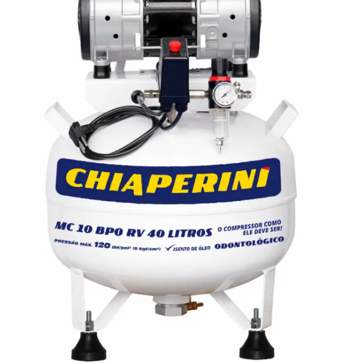 Baixo nível de ruído, isento de óleo, 127V ou 220V, eficiência e qualidade do ar! Estas são características que todos os dentistas procuram na hora de comprar o compressor ideal para o seu consultório. A nova linha de Motocompressores BPO(Baixa Pressão Odontológico) poderá atender consultórios com equipo completo e sugador* para facilitar o trabalho e atendimento no dia-a-dia! Informação adicionalDeslocamento Teórico 284 l/min – 10 pcm Pressão máxima 120 psi – 8,3 bar Reservatório 40L Nº de Cilindros 2 Nº de Estágios 1 RPM do Bloco 1740 Motor Elétrico 2hp – 1,5 kW – 4P Peso do Cabeçote 19,5kg Peso C/ Embalagem C/ Motor Monofásico (Odonto) 49kg DescriçãoAcompanha o Motocompressor odontológico 10 pcm 40 litros:– Bloco compressor– Reservatório vertical– Motor 127V ou 220V– Cabo elétrico com plugue– Filtro de ar– Dreno (válvula purgadora)– Registro de saída de ar– Manômetro– Válvula de retenção– Pressostato– Regulador de pressão com manômetro– Válvula de segurança– Vibraless– Coxim entre o bloco compressor e o reservatório– Pintura antibacteriana– Prontuário de vaso de pressão– Rede nacional de Assistência Técnica– Manual de instruções– Certificado de garantiaImportante: Nossos compressores de ar chegam ao usuário com Prontuário de Vaso de Pressão, elaborado conforme estabelece a norma NR-13 do MT, atestado por engenheiro mecânico responsável registrado no CREA.O prontuário identifica o produto, os dados de projeto, os materiais utilizados, os aspectos construtivos, os procedimentos de inspeção e os dispositivos de segurança.Portanto, todos os reservatórios são testados hidrostaticamente garantindo a segurança dos produtos.A fabricação dos reservatórios CHIAPERINI atende também as especificações de projeto da norma ASME (Sociedade Americana de Engenheiros Mecânicos). A CHIAPERINI INDUSTRIAL LTDA garante esse produto ao cliente contra qualquer defeito de fabricação no prazo de 12 (doze) meses, sendo:– Garantia legal de 3 meses contra defeito de fabricação – Garantia estendida de 9 meses – Garantia total de 12 meses