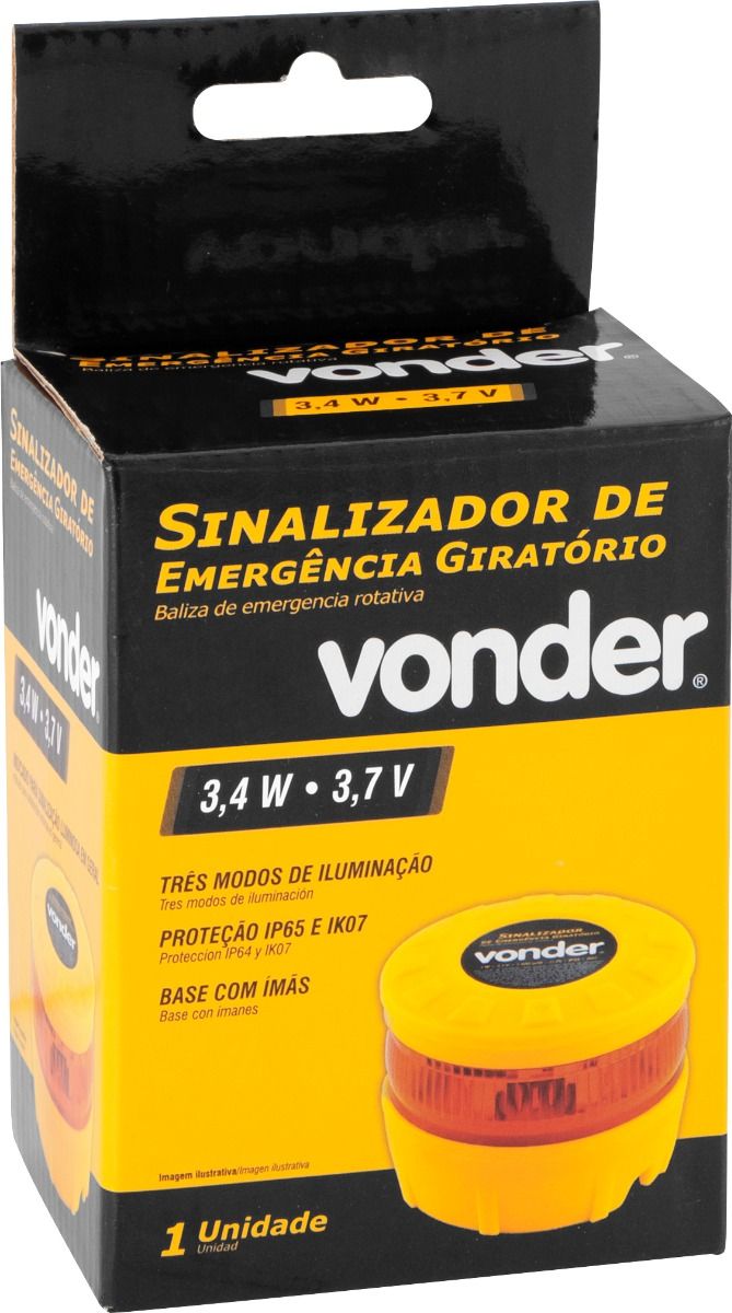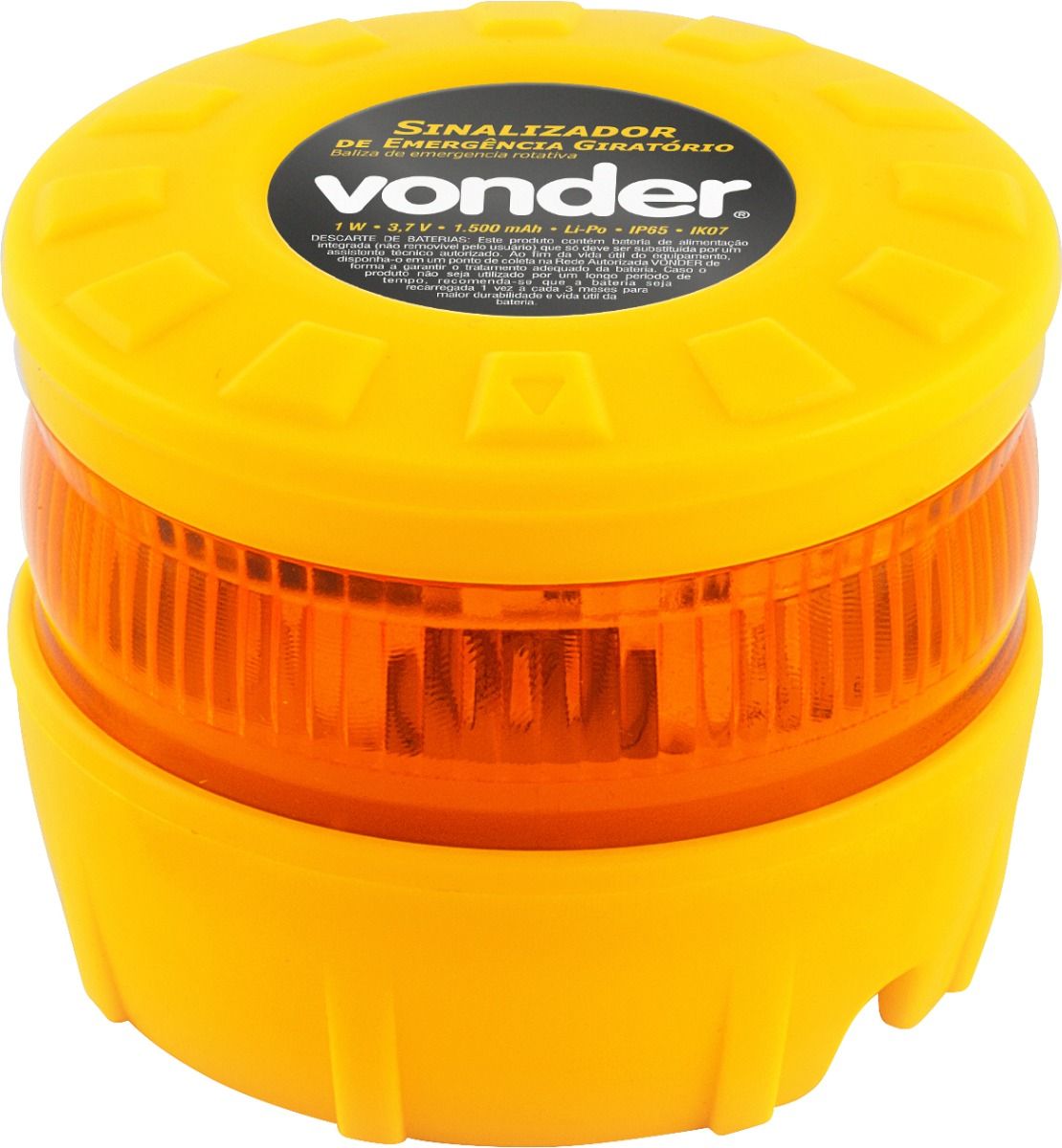 Marca: VonderConteúdo da embalagem:1 Sinalizador de emergência. Acompanha: 1 cabo USB-C.Destaques e diferenciais:Possui base com dois ímãs, possibilitando a fixação em estruturas metálicas. Conta ainda com três modos de iluminação (giratório, piscando e contínuo), ajustando-se a diversas necessidades. Proteção IP65 e IK07.Aplicações e dicas de uso:Indicado para sinalização luminosa em geral.Detalhes TécnicosPotência: 3,4 W Diâmetro: Ø 71 mm Material (tipo/composição): Plástico ABS Altura: 57 mm Tipo de lâmpada: Led SMD Autonomia aproximada: Giratório: 8 h; Piscando: 20,5 h; Contínuo: 2,5 h Alimentação: Bateria recarregável - 3,7 V - 1.500 mAh - Li-Po Massa aproximada (peso) (kg): 0,160 kg Garantia - E (CDC):Garantia legal: 90 dias