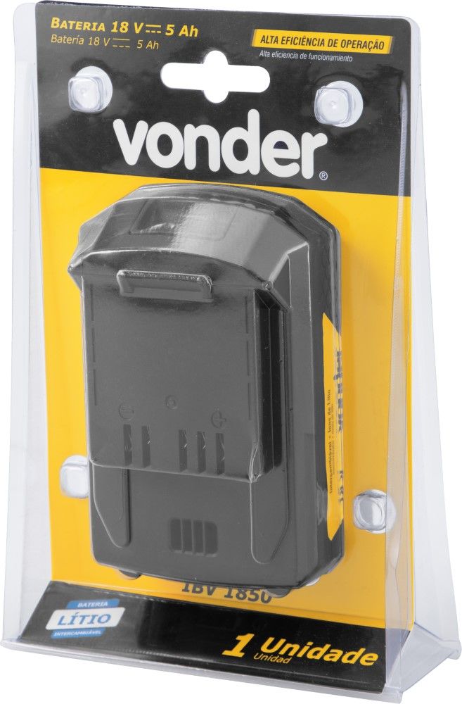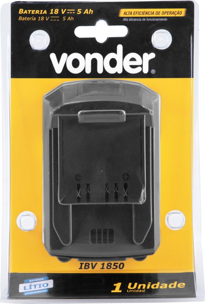 Marca: VonderCódigo: 6004185000Conteúdo da embalagem1 Bateria.Destaques e diferenciais:Bateria de íons de lítio, garantindo alta eficiência de operação. Possui indicador de nível de carga. Os três LEDs vermelhos indicam o status de carga da bateria. Um LED aceso: indica baixa carga; dois LEDs acesos: metade da carga; e três LEDs acesos: bateria carregada. Possui entrada de ar para sistema de refrigeração e base emborrachada que ajuda a prevenir riscos em superfícies e absorver impactos leves.Aplicações e dicas de uso:Indicada para a linha de ferramentas a bateria intercambiável VONDER. Carregadores indicados: carregador de bateria 18 V ICBV 1805 (6004180500), carregador de bateria carga rápida 18 V ICBV 1806 (6004180600), carregador de bateria duplo 18V ICBV1841 (6004184100), carregador de bateria rápido duplo (6004184200) ou carregador de bateria para automóveis 12 V (6004184300).Modelo: IBV1850 Tipo de bateria: Íons de lítio Tensão (V): 18,0 V Capacidade da bateria (A): 5,0 Ah Indicador de bateria fraca: Sim Massa aproximada (peso) (kg): 0,72 kg Garantia - E (CDC):Garantia legal: 90 dias + Garantia contratual: 9 meses