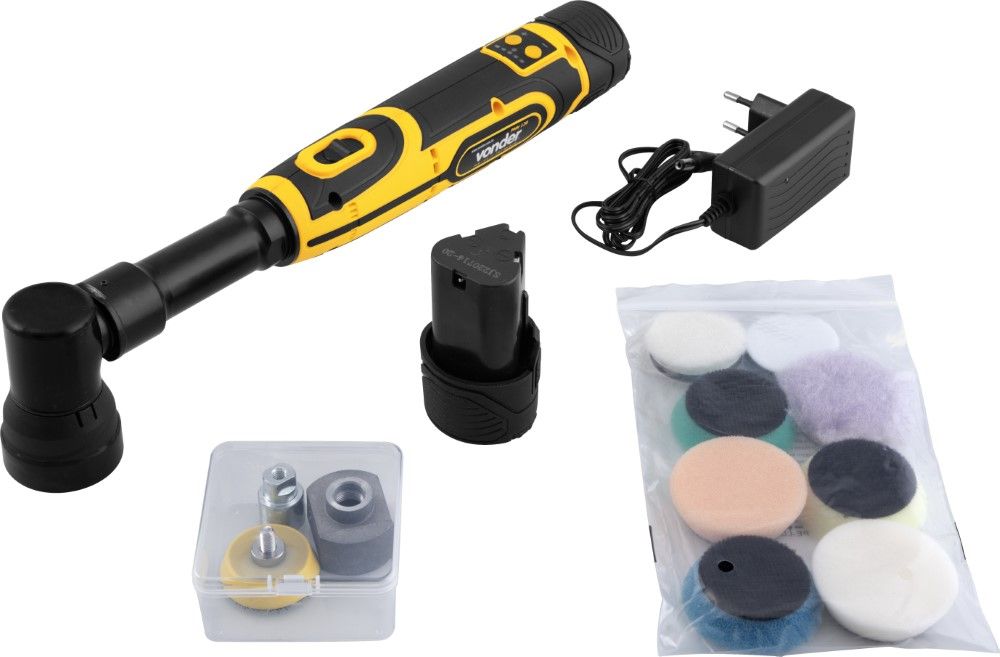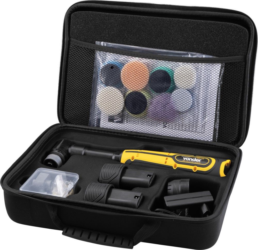 Marca: VonderCódigo: 6001120080Conteúdo da embalagem1 Politriz mini. Acompanha: 1 maleta, 2 baterias 12V - 2Ah íons de lítio, 1 fonte para carregamento 100 V~ a 240 V~ bivolt automática, 1 adaptador rotativo orbital, 1 adaptador roto-orbital leve, 1 adaptador roto-orbital pesado, 1 disco fixa fácil, 1 protetor do disco, 2 chaves especiais e 8 acessórios para polimento.Destaques e diferenciais:Equipamento leve, prático e compacto.Aplicações e dicas de uso:Indicada para polimentos em geral, principalmente detalhamento automotivo.Modelo: PMV 120 Bateria: 12 V 2 Ah - Íons de lítio Diâmetro da esponja: 38 mm Excentricidade: 3 mm e 12 mm Rotações por minuto (rpm): Velocidade 1: 1900 /min; Velocidade 2: 2300 /min; Velocidade 3: 2700 /min; Velocidade 4: 3600 /min; Velocidade 5: 4100/min Tensão da bateria (V): 12 V 2 Ah Tensão do carregador de bateria (V~): 100 V~ a 240 V~ - Bivolt automático Frequência (Hz): 50 Hz / 60 Hz Aceleração transmitida nas mãos - braços do operador - ah: 22,4 m/s² Incerteza da aceleração transmitida nas mãos - braços do operador - k: 1,5 m/s² Massa aproximada (peso) (kg): 2,6 kg Garantia - E (CDC):Garantia legal: 90 dias + Garantia contratual: 9 meses (Para locadoras, garantia única e exclusiva de 90 dias)
