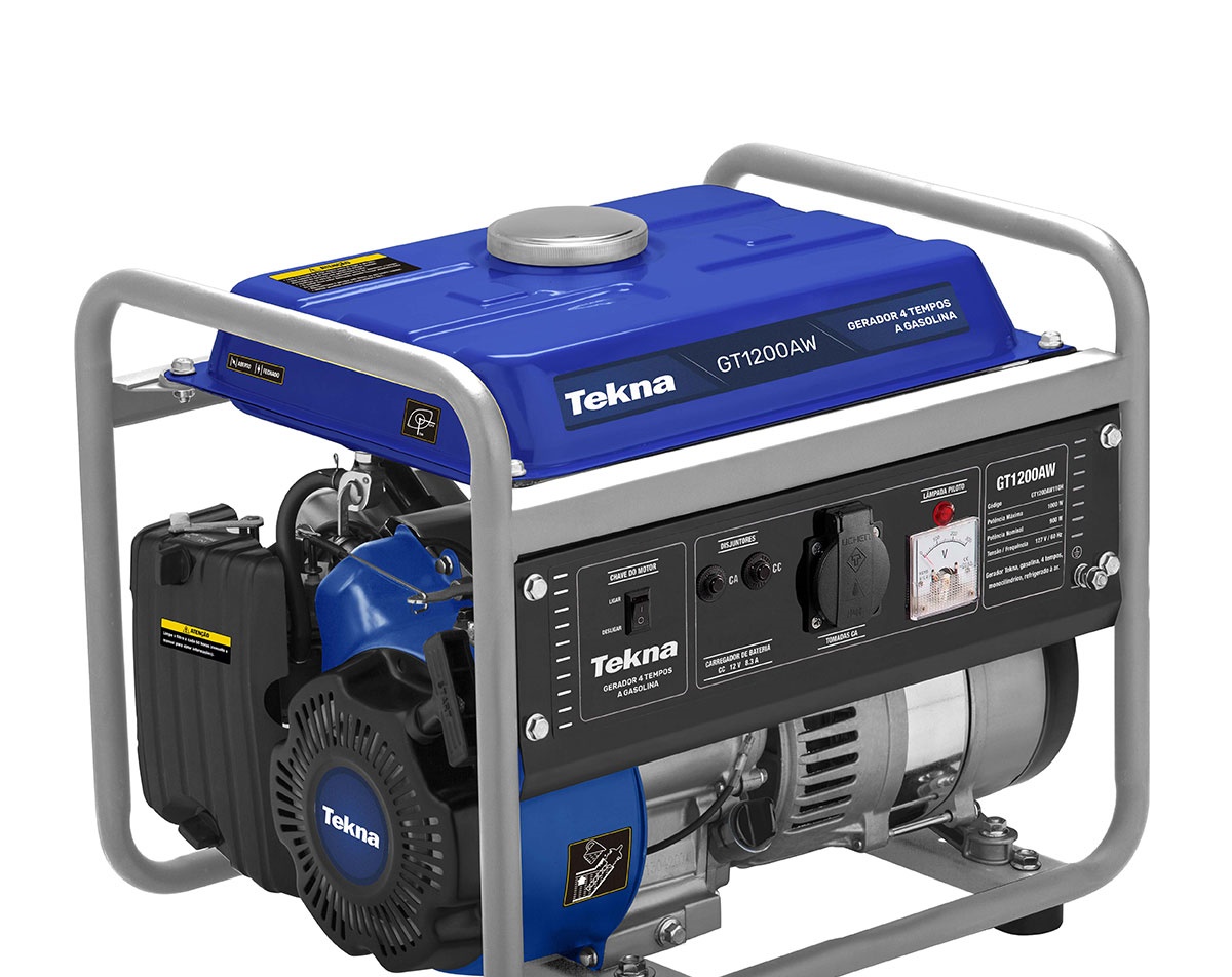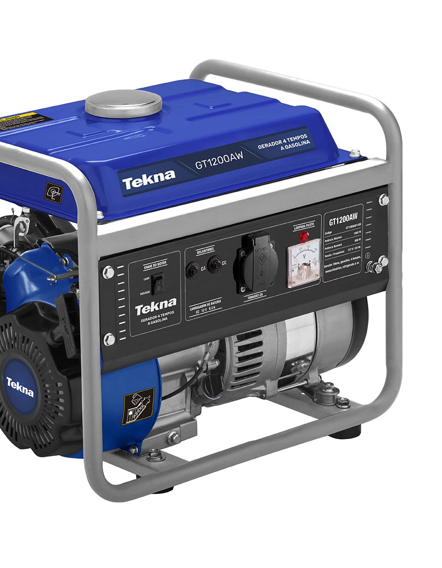 Cód. Fornecedor: GT1200AW-110Marca: Tekna• Motor 4 Tempos• 98 Cilindradas• Potência de Máxima 1100 W• Tensão de saída 110V• Alerta de Nível de ÓleoO Gerador a Gasolina Tekna GT1200AW é econômico, com baixo consumo de combustível. Equipado com um potente motor 4 tempos, 1100 W de potência. • Econômico• Com Capacitor e Voltímetro• Quadro Reforçado• Carregador de Bateria Informações AdicionaisO Gerador a Gasolina Tekna GT1200AW foi desenvolvido para uso frequente, com excelente autonomia e estabilidade na geração de energia. É seguro e ideal para garantir o funcionamento de ferramentas, iluminação ou eletrodomésticos em sua casa ou no acampamento. Possui quadro reforçado, para garantir a firmeza e segurança do Gerador. Equipado com carregador de bateria, voltímetro e alerta de nível de óleo.