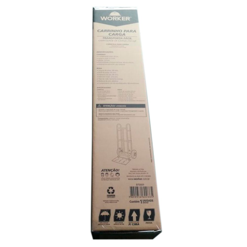 Código do Fornecedor: 975931 Marca: Worker Conteúdo da embalagem: 1 Carrinho Para Carga 250Kg Metálico Pneu Maciça Transp. Fácil Worker O carrinho de carga da Worker é muito útil para carregar objetos pesados (como móveis, esquadrias, ferragens e até mesmo materiais de construção) em locais como armazéns, estoques e indústrias. Feito de metal resistente, ele permite que você carregue uma grande quantidade de peso, com maior facilidade. Especificação do produto: Carrinho: Cor vermelho Estrutura em aço carbonoPossui molas na plataforma que facilitam o levantamento da carga, diminuindo o esforço Características técnicas: Comprimento total: 55 cmLargura total: 57,5 cmAltura: 120 cmProfundidade x largura da base: 40 cm x 28 cmRoda: Borracha maciçaAro plástico Largura do pneu: 80 mmPerfil do pneu: 60 mmDiâmetro do aro: 90 mmDiâmetro total: 210 mmComprimento útil do eixo/diâmetro: 90 mm/20 mm Garantia: 3 meses