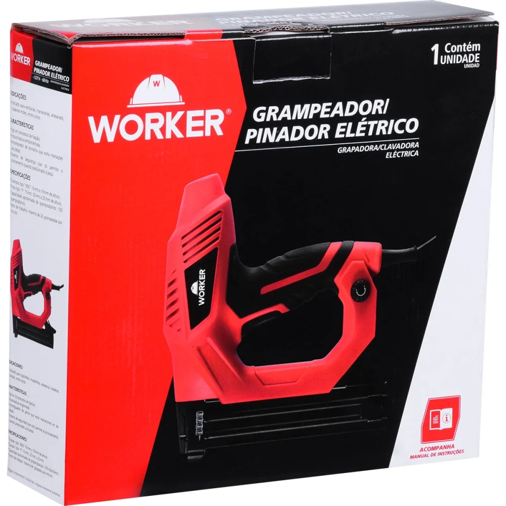 Código do Fornecedor: 976849 Marca: Worker Conteúdo da embalagem: 1 Grampeador Pinador Elétrico 127V Worker O Grampeador e Pinador Elétrico 60Hz 127V Worker é uma ferramenta elétrica versátil e eficiente que pode ser usada para fixar uma variedade de materiais, incluindo madeira, tecido, papelão e plástico, indicado para estofarias, marcenarias, artesanato, madeiras moles, entre outros. Com uma potência de 20W, este grampeador e pinador elétrico é capaz de disparar grampos e pinos com rapidez e precisão.O design ergonômico deste grampeador e pinador elétrico torna-o confortável de usar por períodos prolongados de tempo, reduzindo a fadiga das mãos e dos pulsos. Além disso, ele vem com um sistema de segurança que impede o disparo acidental de grampos ou pinos.Se você está procurando uma ferramenta elétrica eficiente e versátil para ajudar a simplificar seus projetos, o Grampeador e Pinador Elétrico 60Hz 127V Worker é uma excelente escolha! Características: Voltagem: 127 VFrequência: 60 HzPeso; 1,6 KgGrampos tipo "600": 16 mm e 19 mm de alturaPinos tipo "F": 15 mm, 20 mm e 25 mm de alturaCapacidade aproximada de grampos/pinos: 100 grampos/pinosFator de trabalho: máximo de 20 grampeadas por minuto Especificações: Ágil em processos de fixaçãoEmpunhadura emborrachada para proporcionar maior conforto ao operadorAmortecedor de borracha que evita marcações nas peçasSistema de segurança que só permite o acionamento quando pressionado à peça Garantia: 3 meses