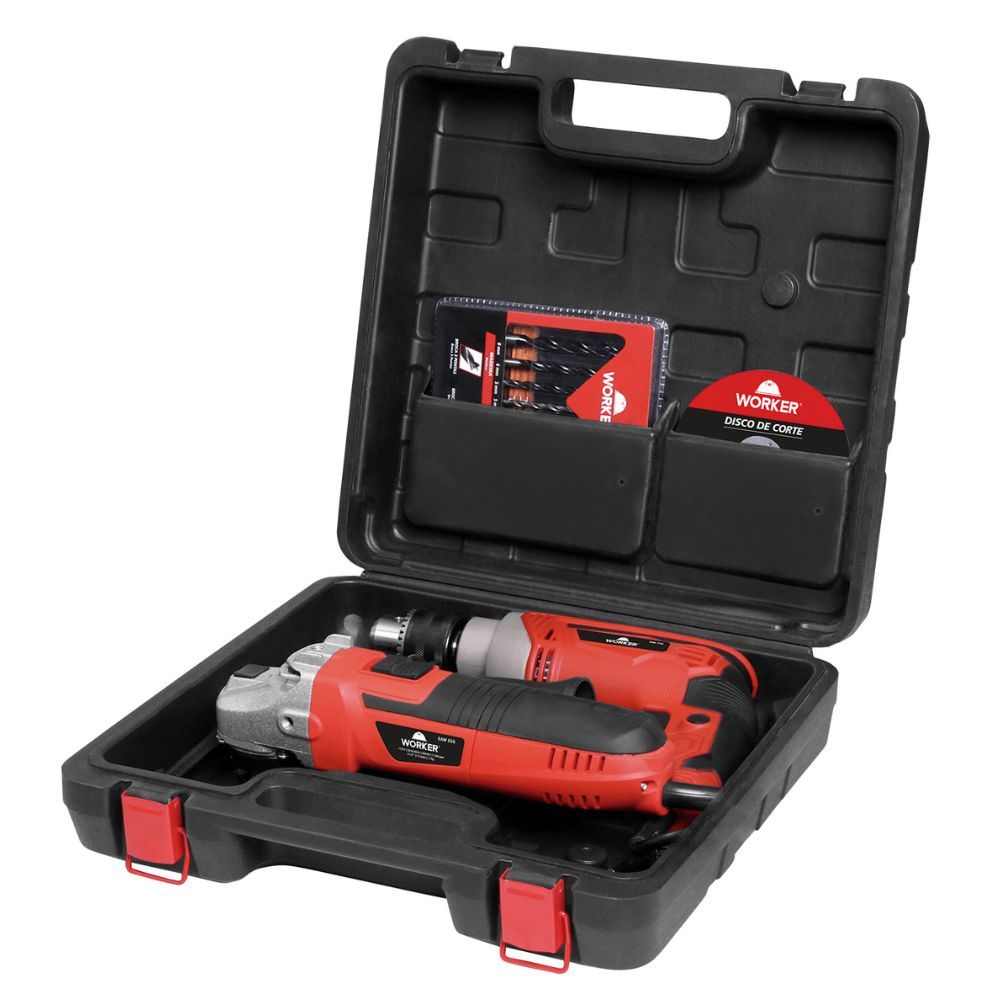 Código do Fornecedor: 163421 Marca: Worker Conteúdo da embalagem: 1 Kit Esmerilhadeira Furadeira 127V 24Pc Worker Especificações: Composto com jogo de brocas combinadas e disco de corteAmbos têm motor com dupla isolação para maior segurança Especificações Esmerilhadeira Angular 650W 127V EAW: Indicada para corte, desbaste e acabamento em superfícies metálicasEmpunhadura ergonômicaBotão trava de eixoInterruptor de acionamentoPossui punho auxiliar com três posições de fixaçãoCom velocidade fixa Características técnicas: Tensão: 127VFrequência: 50 Hz/ 60HzPotência: 650WRotação: 11.500rpmCapacidade do disco: 4.1/2” (115mm)Rosca do eixo: M 14Pressão sonora: 84 dB (A)Nível de ruído: 95 dB (A)Nível de vibração: 3,54 m/s²Peso: 1,7 kgNorma: ABNT NBR IEC 60745-1 Acompanha: 1 punho auxiliar1 chave dois pinos1 capa de proteção com trava de ajuste6 disco de corte Especificações Furadeira de Impacto 710W 127V FIW: Indicada para metal e madeira na função sem impacto e concreto e alvenaria na função com impactoBotão trava para operação continuaCabo com revestimento emborrachadoSistema reversível para a retirada de brocas e parafusosRégua limitadora de profundidade Características: Tensão: 127VFrequência: 50 Hz/ 60HzPotência: 710WRotação: 0 – 3.000 rpmMandril: 1/2” (13mm).Perfuração: aço 13mm – madeira 25mm – concreto 16mmPeso: 1,9 kg Acompanha: 1 punho auxiliar1 chave para mandril1 limitador de profundidade3 brocas de aço rápido3 brocas três pontas para madeira3 brocas ponta de metal duro/vídea Garantia: 6 meses