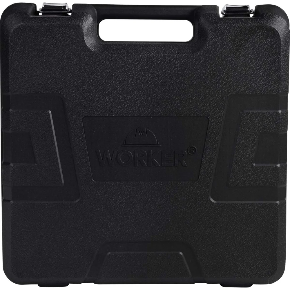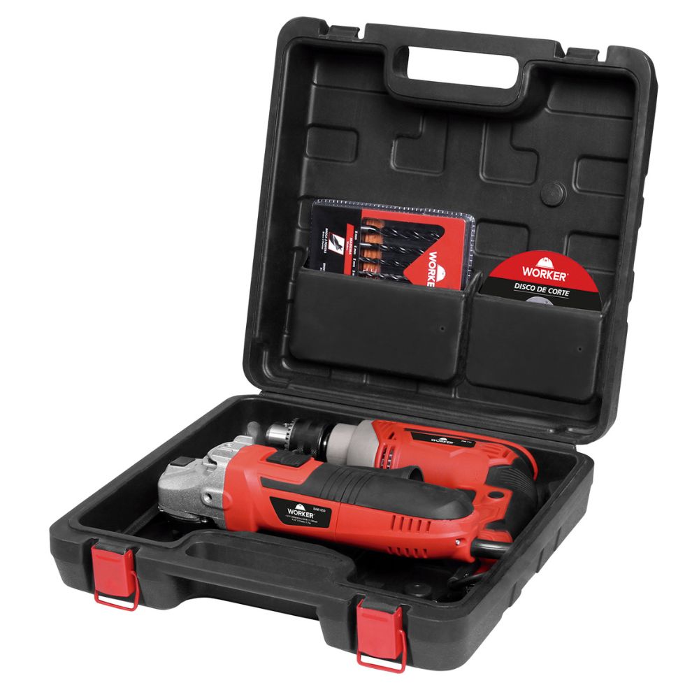 Código do Fornecedor: 163439 Marca: Worker Conteúdo da embalagem: 1 Kit Esmerilhadeira Furadeira 220V 24Pc Worker Composto por jogo de brocas combinadas e disco de corte, o kit ainda conta com motor, dupla isolação para maior segurança e uma maleta para armazenar e transportar todas as peças com facilidade. Especificações Esmerilhadeira Angular EAW 650W 220V: Indicada para corte, desbaste e acabamento em superfícies metálicasEstrutura compactaEmpunhadura ergonômicaBotão trava de eixoInterruptor de acionamentoPossui punho auxiliar com três posições de fixaçãoVelocidade fixa Características técnicas: Tensão: 220VFrequência: 50 Hz/ 60HzPotência: 650WRotação: 11.500rpmCapacidade do disco: 4.1/2” (115mm)Rosca do eixo: M 14Pressão sonora: 84 dB (A)Nível de ruído: 95 dB (A)Nível de vibração: 3,54 m/s²Peso: 1,7 kgNorma: ABNT NBR IEC 60745-1 Acompanha: 1 punho auxiliar1 chave dois pinos1 capa de proteção com trava de ajuste6 disco de corte Especificações Furadeira de Impacto 710W 220V FIW: Indicada para metal e madeira na função sem impacto e concreto e alvenaria na função com impactoBotão trava para operação continuaCabo com revestimento emborrachadoSistema reversível para a retirada de brocas e parafusosRégua limitadora de profundidade Características técnicas: Tensão: 220VFrequência: 50 Hz/ 60HzPotência: 710WRotação: 0 – 3.000 rpmMandril: 1/2” (13mm)Perfuração: aço 13mm – madeira 25mm – concreto 16mmPeso: 1,9 kg Acompanha: 1 punho auxiliar1 chave para mandril1 limitador de profundidade3 brocas de aço rápido3 brocas três pontas para madeira3 brocas ponta de metal duro/vídea Garantia: 6 meses