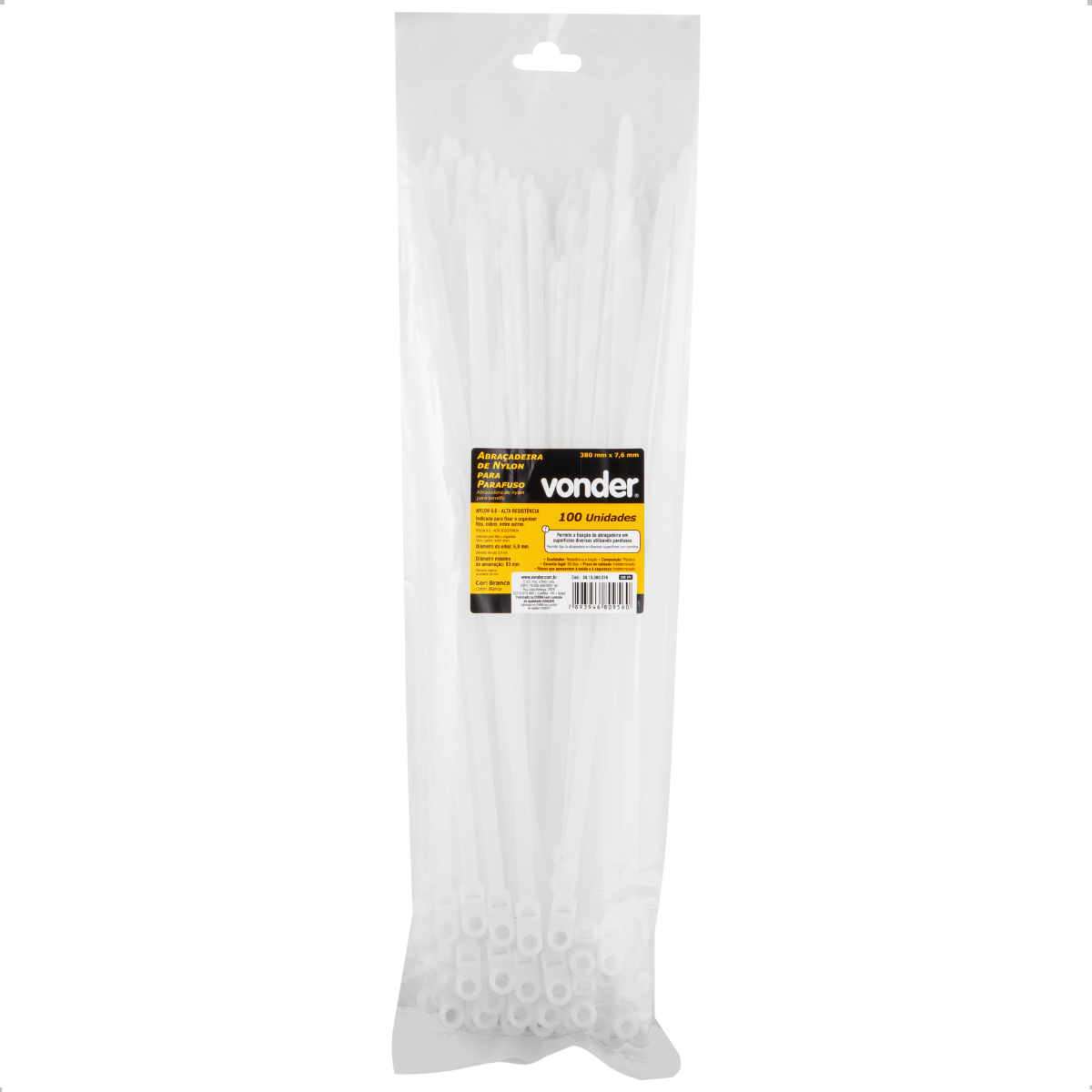 Abraçadeira Nylon Vonder para Parafusos 380 x 7,6 mm Branca 100 Peças - Vonder OficialOrganização, firmeza e praticidade são fundamentais em qualquer ambiente de trabalho, seja em instalações elétricas, montagens industriais ou projetos de informática. E é exatamente isso que a Abraçadeira de Nylon Vonder para Parafusos 380 x 7,6 mm Branca (100 peças) oferece: uma solução resistente, versátil e confiável para fixação e agrupamento de cabos, fios e componentes com eficiência profissional.Fabricada em Nylon 6.6, material conhecido por sua alta resistência à tração, à abrasão e ao desgaste, essa abraçadeira é ideal para aplicações que exigem durabilidade e segurança no manuseio dos materiais. Seu comprimento de 380 mm e largura de 7,6 mm permitem a fixação de volumes médios a grandes com firmeza, enquanto o diâmetro máximo de amarração de 93 mm garante flexibilidade no uso com diferentes espessuras de agrupamentos.Um dos destaques dessa abraçadeira é o seu olhal com 6,8 mm de diâmetro, que facilita a fixação com parafusos em painéis, racks, paredes ou qualquer superfície que exija passagem e amarração organizadas — recurso especialmente útil em instalações elétricas, data centers, quadros de comando e ambientes de TI. A cor branca também favorece a visualização em ambientes limpos ou com padronização visual específica, como laboratórios e escritórios.Com peso aproximado de 0,52 kg por pacote, o conjunto com 100 unidades oferece um excelente custo-benefício, entregando quantidade e qualidade em uma única solução. Práticas e rápidas de aplicar, as abraçadeiras de nylon Vonder garantem fixação segura, sem necessidade de ferramentas especiais, otimizando o tempo de instalação e contribuindo diretamente para a produtividade do seu dia a dia.Especificações- Material (tipo/composição): Nylon 6.6- Cor: Branca- Comprimento nominal: 380 mm- Largura: 7,6 mm- Diâmetro do olhal: 6,8 mm- Diâmetro máximo de amarração: 93 mm- Massa aproximada (peso) (kg): 0,52 kg- Destaques e diferenciais: Produzida em nylon 6.6 que proporciona maior resistência à tração.Itens inclusos- 1 Bolsa plástica com 100 abraçadeiras de nylon.Garantia- 90 dias com o fabricante