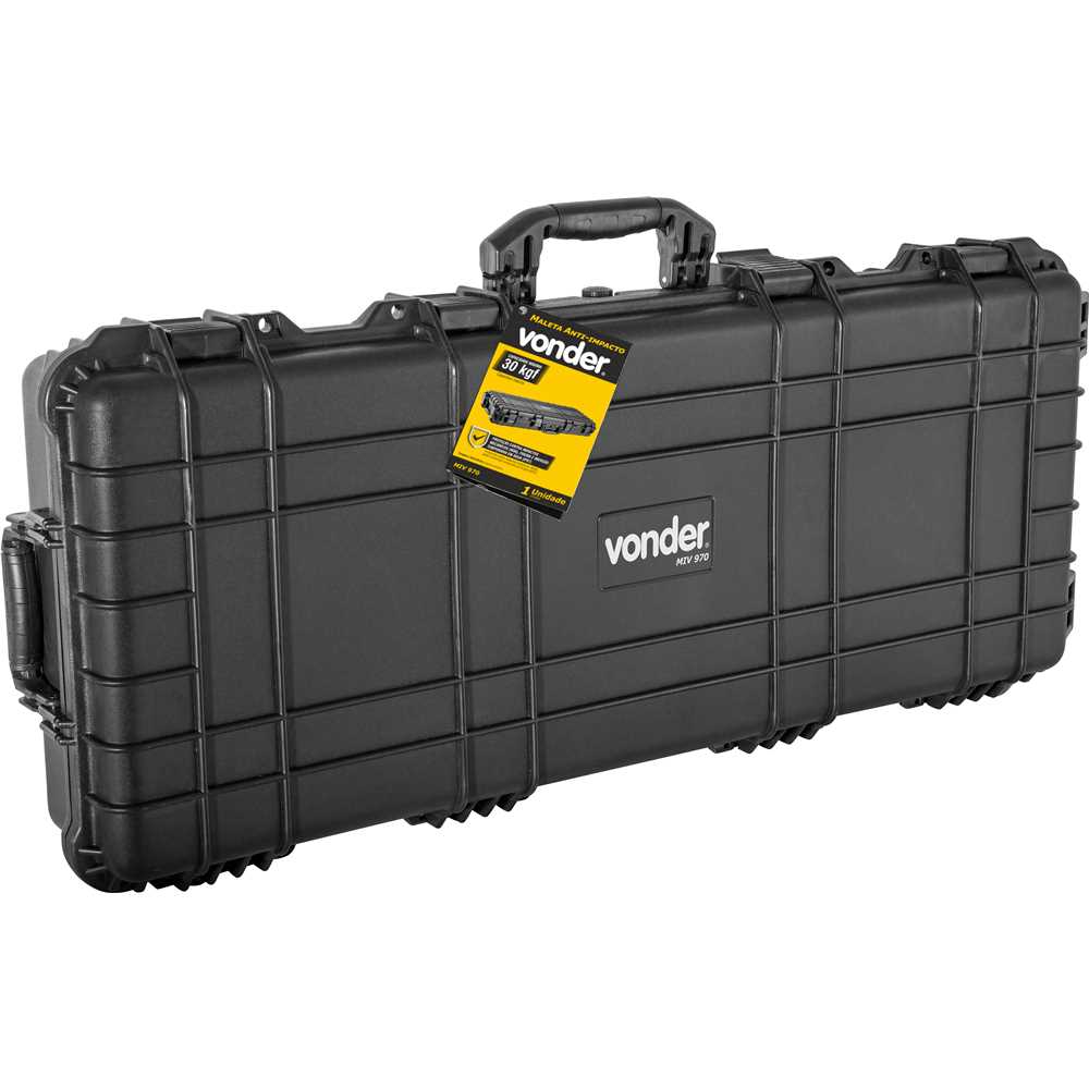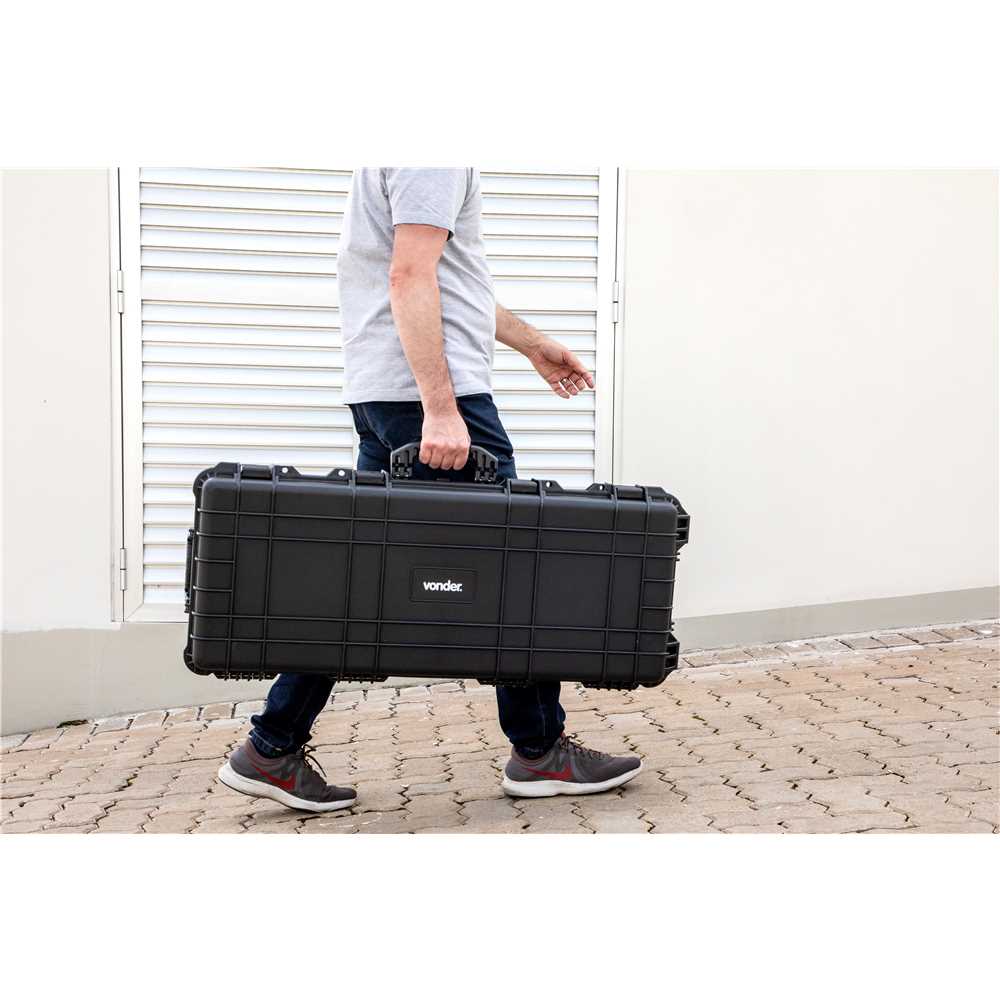 Código Fornecedor: 6109000970Marca: Vonder Conteúdo da embalagem:1 Maleta anti-impacto.Destaques e diferenciais:Possui na parte interna espumas removíveis que oferecem máxima proteção. Na parte superior, a espuma é tipo "caixa de ovos" e, na parte inferior, a espuma é pré-recortada em blocos, que se moldam ao formato e tamanho de cada objeto, conforme necessidade. Possui proteção IP67 (6 = totalmente protegida contra poeira e 7 = Protegido contra imersão temporária em água). Possui válvula manual de compensação de pressão que equilibra a pressão interior com a exterior, facilitando a abertura da maleta. Conta com índice de proteção contra impactos mecânicos (IK08), 4 travas e 4 porta-cadeados (não acompanham cadeados). Além de rodas para transporte, facilitando a movimentação.Aplicações e dicas de uso:Indicada para acondicionamento de produtos que requerem maior cuidado no transporte e armazenamento, pois possui proteção contra impactos e umidade (IP67).Detalhes TécnicosModelo: MIV 970 Material da maleta para ferramentas: PP (Polipropileno) Cor: Preta Comprimento: 970,0 mm Largura: 450,0 mm Altura: 165,0 mm Comprimento interno: 870,0 mm Largura interna: 350,0 mm Altura interna: 135,0 mm Capacidade máxima de carga: 30,0 kgf Índice de proteção (IP): IP 67 Índice de proteção contra impactos mecânicos (IK): IK-08 Massa aproximada (peso) (kg): 7,80 kg Garantia - E (CDC):Garantia legal: 90 dias
