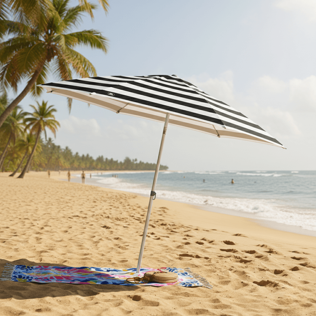 Guarda Sol Bel Milagres 2,40m: Proteção e Estilo para Seus Momentos de Lazer O Guarda-Sol Bel Milagres de 2,40 metros é a combinação perfeita de proteção solar, design moderno e praticidade. Com um charmoso padrão listrado em preto e branco, este guarda-sol eleva o estilo dos seus dias de praia, piscina, camping ou momentos relaxantes no jardim. Sua cobertura em poliéster com revestimento Silver Coating não apenas reflete os raios solares, proporcionando uma sombra agradável, mas também oferece proteção solar FPS 100, essencial para proteger sua pele dos efeitos nocivos do sol. A estrutura robusta, com varetas em fibra de vidro de 11mm, garante resistência a ventos moderados, enquanto a haste em alumínio de 32mm oferece leveza e durabilidade, ideal para uso em ambientes litorâneos. O sistema de ventilação integrado melhora a circulação do ar, evitando o superaquecimento sob o guarda-sol. Acompanha uma prática sacola tiracolo para facilitar o transporte e armazenamento, tornando-o o companheiro ideal para todas as suas aventuras ao ar livre. Especificações FPS: 100 Sacola para transporte: Sim Cobertura: Poliéster com revestimento Silver Coating Haste: Alumínio Ø 32 mm Armação: Alumínio Varetas: 6 unidades em fibra de vidro de 11 mm Cor: Preto e Branco Listrado Modelo: Milagres Dimensões montado (C x L x A): 2,40 m x 2,22 m Itens Inclusos 01 Guarda-Sol Bel Milagres 2,40 m Preto e Branco Listrado em Alumínio com Varetas de Fibra de Vidro 01 Sacola tiracolo para transporte Perguntas Frequentes (FAQ) Pergunta: Qual o nível de proteção solar deste guarda-sol?Resposta: O Guarda-Sol Bel Milagres oferece proteção solar FPS 100, bloqueando a grande maioria dos raios UV prejudiciais. Pergunta: O guarda-sol é resistente a ventos fortes?Resposta: As varetas em fibra de vidro de 11mm proporcionam boa resistência a ventos moderados. Pergunta: Este guarda-sol vem com sacola para transporte?Resposta: Sim, o produto acompanha uma sacola tiracolo para facilitar o transporte e armazenamento. Pergunta: Qual a garantia do produto?Resposta: Garantia legal: 90 dias