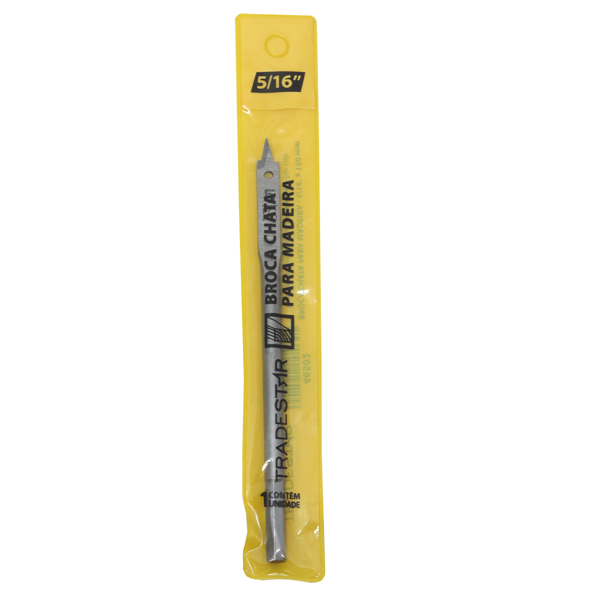 Broca Chata Tradestar 5/16'' para MadeiraA Broca Chata Tradestar 5/16'' para Madeira é a ferramenta ideal para quem precisa realizar furos de grande diâmetro em peças de madeira de forma rápida e precisa. Desenvolvida para uso em furadeiras elétricas ou a bateria, ela é amplamente utilizada em marcenarias, carpintarias, construção civil e projetos de bricolagem.A ponta central atua como guia, enquanto as arestas laterais cortantes ampliam o diâmetro do furo de forma rápida e eficiente. Essa geometria reduz o esforço da ferramenta elétrica, aumentando a produtividade e proporcionando um acabamento limpo. O corpo em aço tratado oferece resistência e durabilidade, suportando uso frequente sem perda de desempenho.A Broca Chata Tradestar 5/16'' é especialmente recomendada para madeiras maciças, compensados, MDF, MDP e outros derivados. Sua estrutura robusta permite perfurações diretas ou através de sobreposições de chapas de madeira. Além disso, seu formato facilita a remoção dos resíduos, evitando o acúmulo de material e garantindo maior velocidade no trabalho.Para um resultado ainda melhor, é indicado trabalhar com a velocidade de rotação adequada e manter a peça bem fixada, garantindo segurança e precisão. A versatilidade da broca permite que ela seja utilizada tanto por profissionais experientes quanto por hobbistas que buscam qualidade nas suas produções.Especificações- Tipo: Broca chata para madeira- Diâmetro: 5/16''- Indicação de Uso: Perfuração de madeiras maciças, compensados, MDF, MDP e derivados- Compatibilidade: Furadeiras elétricas e a bateriaItens inclusos- 01 Broca Chata Tradestar 5/16'' para MadeiraGarantia- 03 meses com o Fabricante