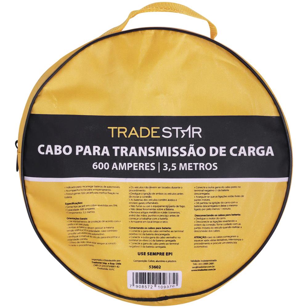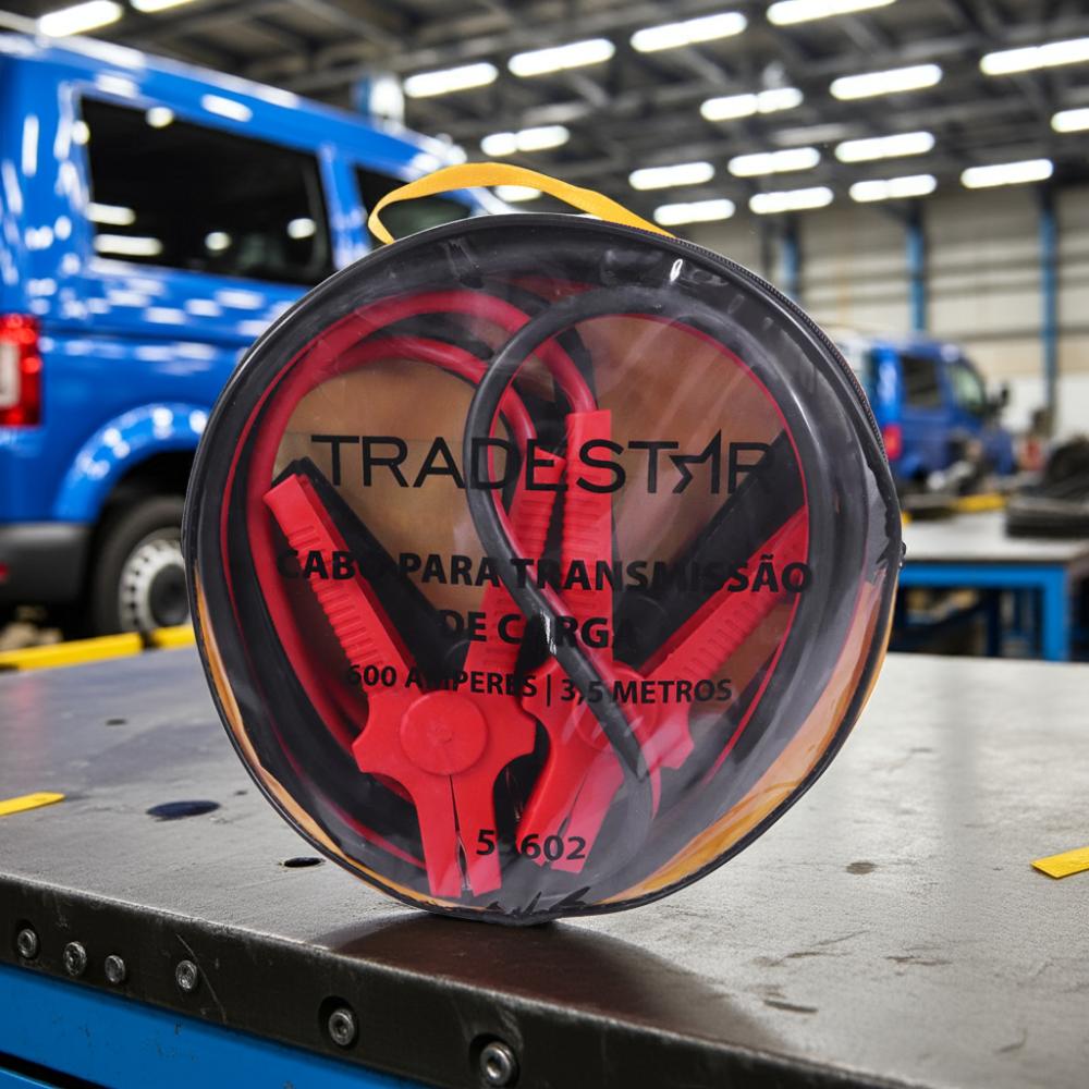 Cabo Carregar Bateria Tradestar 600A 3,5 MetrosO Cabo de Carregar Bateria Tradestar 600A é a solução ideal para quem busca eficiência, segurança e praticidade no processo de recarga de baterias automotivas. Com capacidade de 200 amperes e comprimento de 3,5 metros, este cabo oferece a flexibilidade necessária para conectar baterias em diferentes posições, garantindo mobilidade e facilidade durante o uso.Equipado com garras tipo jacaré de alta qualidade, proporciona uma fixação firme e segura nos terminais da bateria, evitando desconexões acidentais e garantindo uma transmissão de energia estável. Seu design robusto e materiais resistentes tornam este cabo confiável tanto para uso profissional em oficinas mecânicas quanto para uso doméstico em emergências automotivas.Perfeito para eletricistas automotivos, mecânicos e entusiastas de DIY, o Cabo de Carregar Bateria Tradestar 600A combina segurança, durabilidade e eficiência, tornando a recarga de baterias um processo rápido, confiável e sem riscos.Especificações- Capacidade de Corrente: 600A- Comprimento do Cabo: 3,5 metros- Tipo de Garras: Jacaré para fixação segura- Material: Cabo condutor de alta resistência- Aplicações: Carregamento de baterias automotivas, oficinas mecânicas, uso doméstico de emergênciaItens inclusos- 1 Cabo de Transmissão para Bateria 600A 3,5 MetrosGarantia- 03 meses com o Fabricante