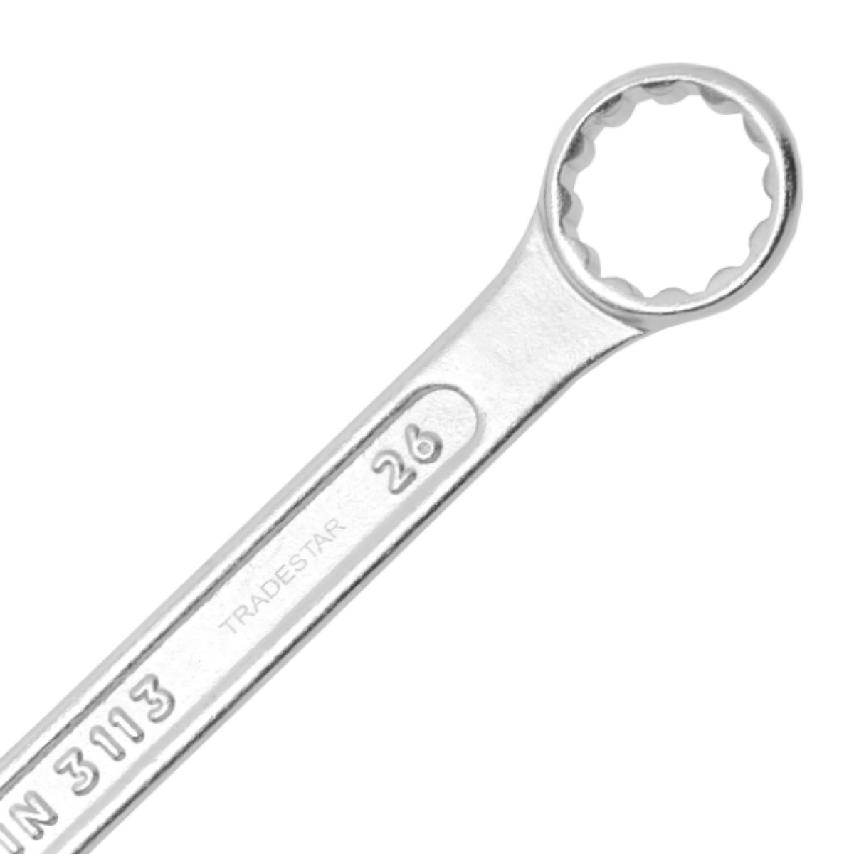 Chave Combinada Tradestar 26 mm Cromo VanádioA Chave Mista Tradestar 26 mm Cromo Vanádio é uma ferramenta de uso profissional desenvolvida para oferecer máxima eficiência, durabilidade e segurança em serviços que exigem alto torque. Composta por uma extremidade do tipo boca e outra do tipo estrela, a Chave Mista Na extremidade de boca, a chave proporciona agilidade no aperto e desaperto de porcas e parafusos sextavados de 26 mm, sendo ideal para trabalhos em que há mais espaço para movimentação. Já a extremidade estrela garante um encaixe firme e preciso, envolvendo o fixador em seis pontos. Isso distribui melhor a força aplicada, evita o arredondamento das cabeças dos parafusos e aumenta a segurança na execução do trabalho.Um grande diferencial deste modelo é a fabricação em aço Cromo Vanádio (CR-V), material reconhecido por sua elevada resistência mecânica, durabilidade e maior proteção contra desgaste e deformações. Esse tipo de liga metálica é amplamente utilizado em ferramentas profissionais justamente por oferecer desempenho superior em aplicações exigentes, garantindo longa vida útil mesmo sob uso constante.Além disso, a chave possui acabamento preciso, que assegura um encaixe adequado e reduz deslizamentos, aumentando a eficiência em cada movimento. Essa característica é especialmente importante em operações de manutenção automotiva, ajustes em máquinas industriais e serviços de infraestrutura, onde confiabilidade e precisão são fundamentais. A Chave Combinada Tradestar 26 mm CR-V representa a união entre qualidade, resistência e versatilidade. Seja para uso profissional ou em aplicações mais específicas de manutenção pesada, ela entrega o que o usuário precisa: confiança em cada aperto.Especificações- Tipo: Chave Combinada (Boca + Estrela)- Medida: 26 mm- Material: Aço Cromo Vanádio (CR-V)- Acabamento: Preciso e resistente- Aplicações: Manutenção automotiva, industrial, agrícola e construção civilItens inclusos- 01 Chave Mista Tradestar 26 mm Cromo VanádioGarantia- 03 meses com o Fabricante