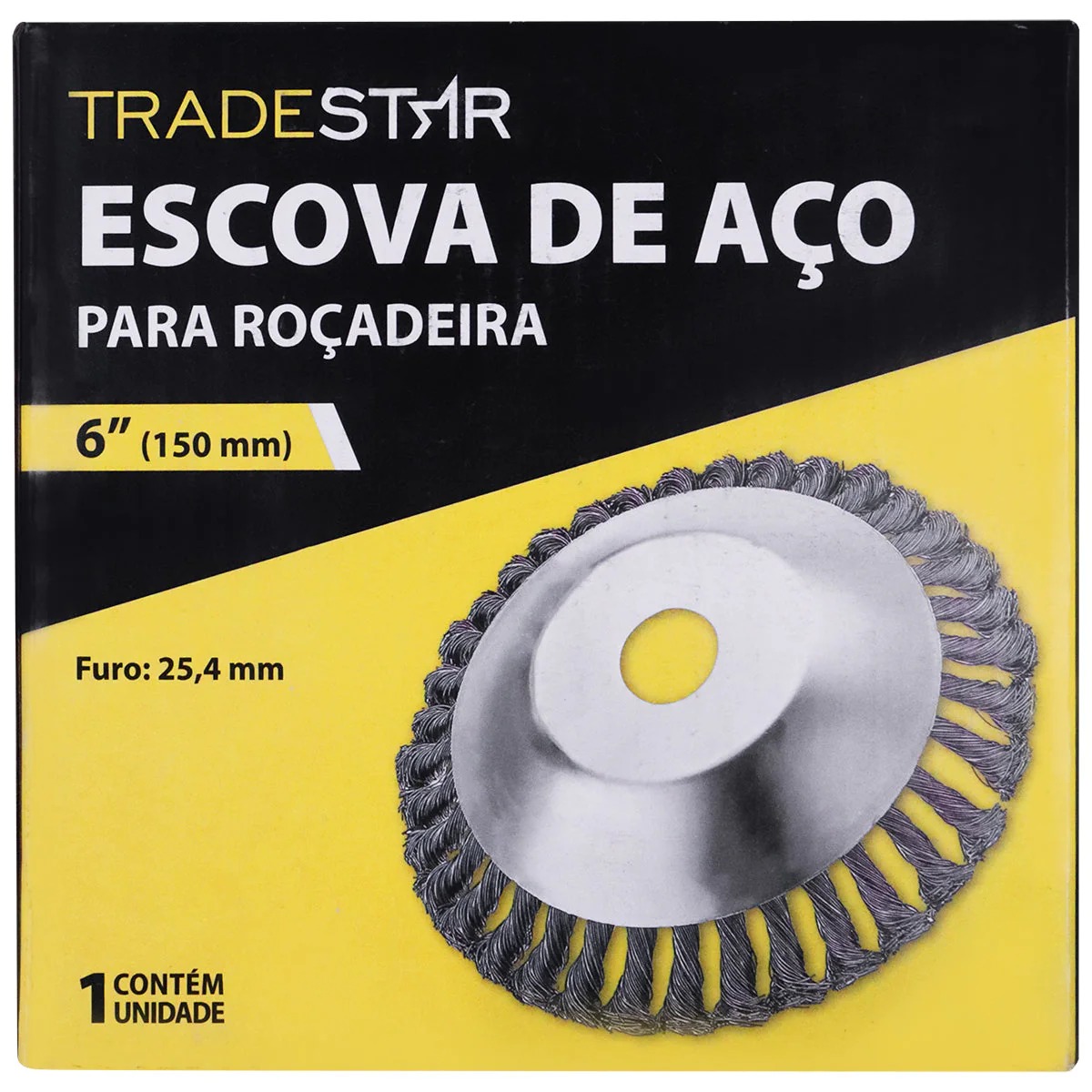 Escova Rotativa de Aço Tradestar 6” para RoçadeiraA Escova Rotativa de Aço Tradestar 6” para Roçadeira é a escolha ideal para quem busca eficiência, resistência e praticidade em serviços de limpeza pesada em áreas externas. Desenvolvida em aço carbono de alta resistência, oferece excelente durabilidade e desempenho superior, sendo amplamente utilizada por paisagistas, profissionais de manutenção urbana e empresas de limpeza.Com design rotativo, esta escova proporciona um trabalho ágil, eficiente e preciso, alcançando até mesmo locais de difícil acesso. Sua ação mecânica remove facilmente grama, musgo, ervas daninhas, mofo e detritos sem causar danos ao pavimento, tornando-se indispensável em superfícies como concreto, asfalto, meio-fio, pavers e paralelepípedos.O formato robusto aliado ao sistema de fixação compatível com a maioria das roçadeiras do mercado permite instalação simples e rápida, garantindo praticidade ao operador. Além disso, sua rotação máxima de 10.000 RPM assegura alto rendimento em serviços pesados, reduzindo o tempo de trabalho e proporcionando um acabamento limpo e uniforme.Especificações- Diâmetro: 6”- Furo central: 25,4mm- Rotação máxima: 10.000 RPM- Material: Aço carbono de alta resistência- Compatibilidade: Roçadeiras a gasolina e elétricas compatíveis com disco de 6”Itens inclusos- 1 Escova Circular 6" Aço Torcido para RoçadeiraGarantia- 03 meses com o Fabricante