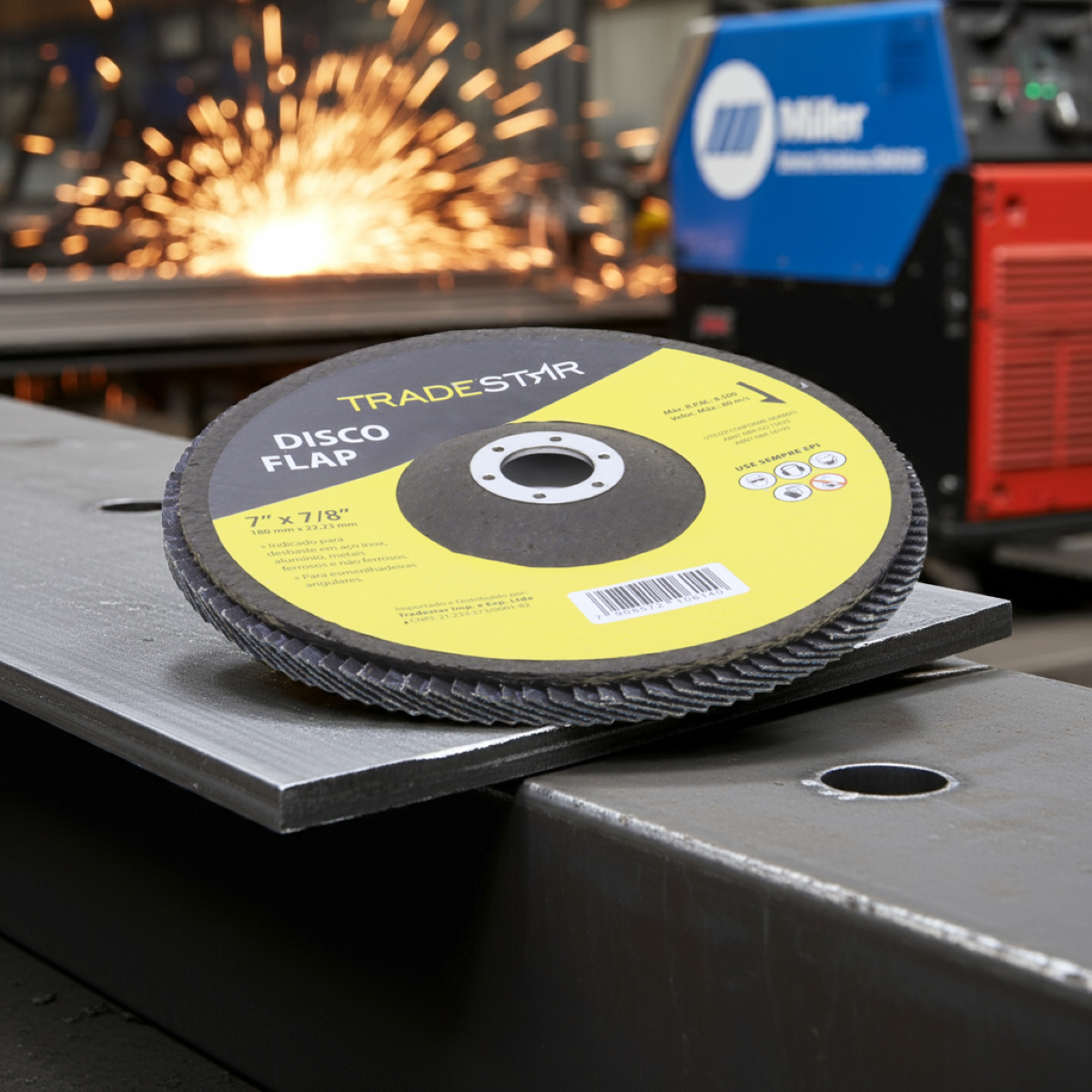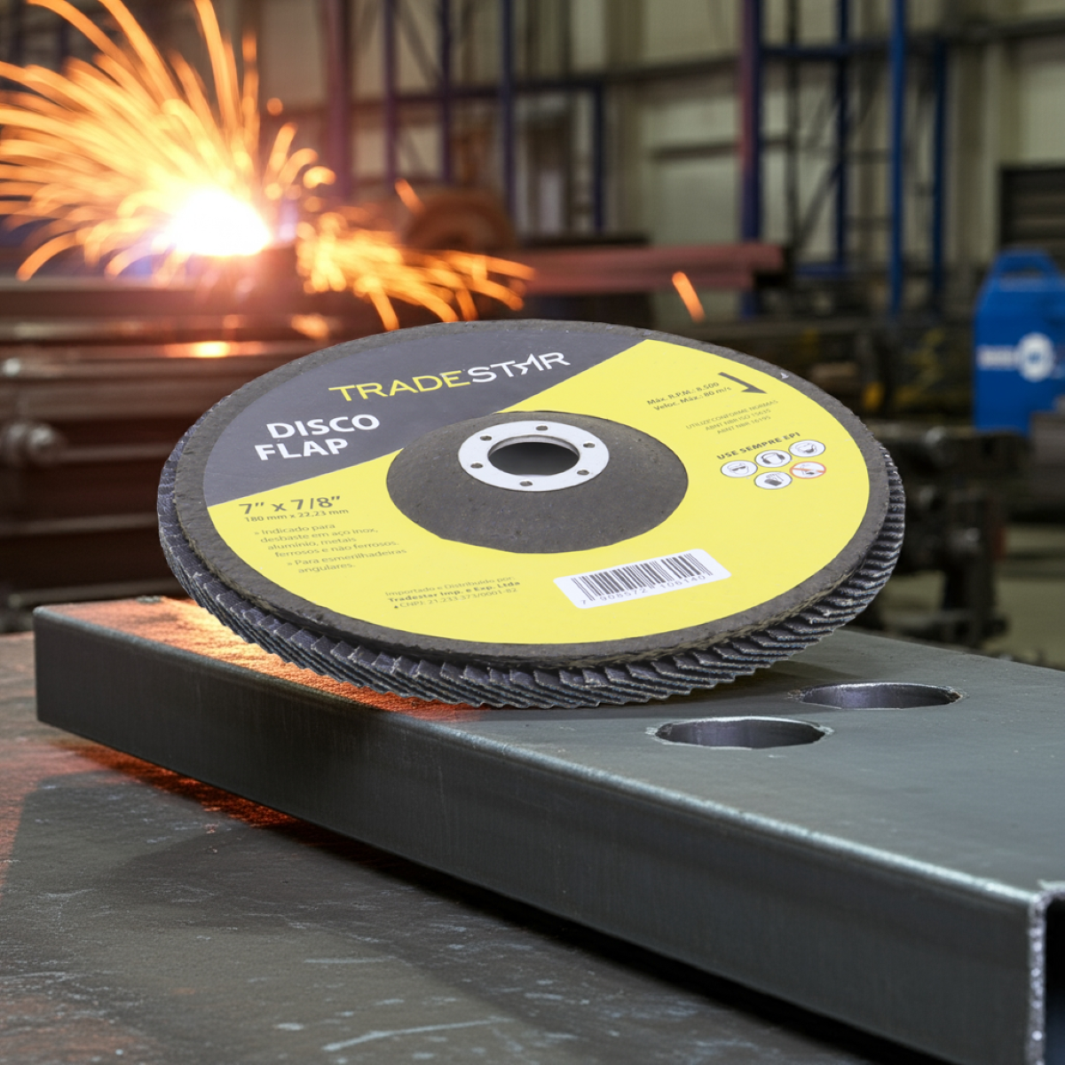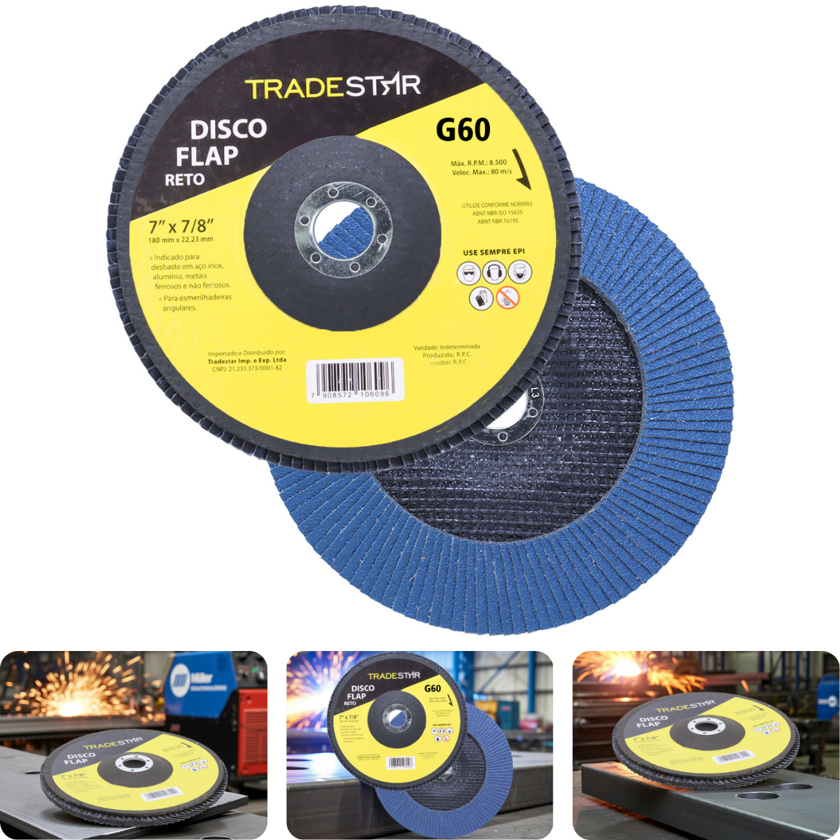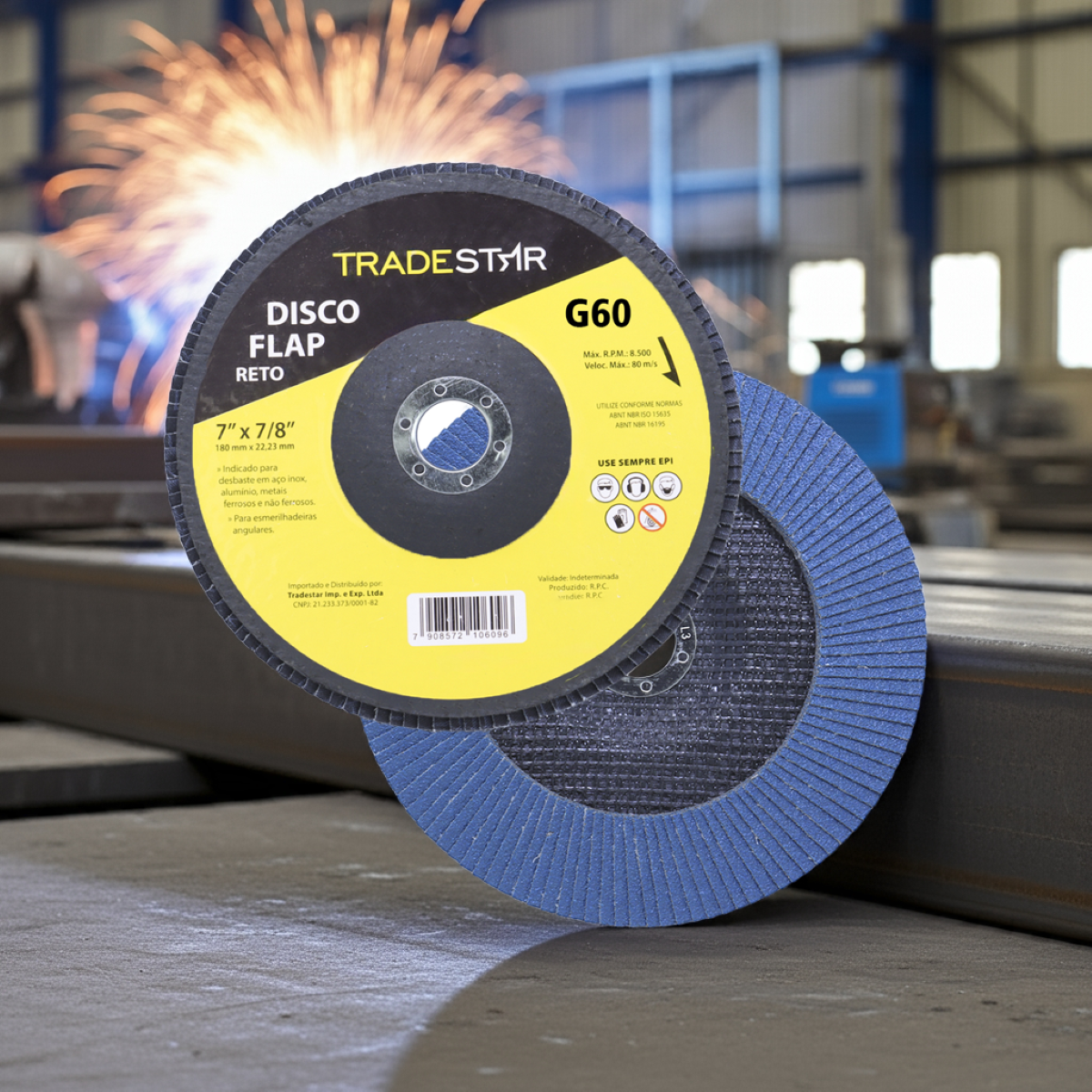 Disco de Desbaste Tradestar 180 mm G60 Fibra Reto Azul Aço e InoxO Disco de Desbaste Tradestar 180 mm G60 Fibra Reto Azul é a escolha ideal para quem busca eficiência, durabilidade e resultados profissionais em trabalhos de desbaste e acabamento em metais. Projetado especialmente para aplicações em aço e inox, este disco flap une qualidade e desempenho, atendendo tanto às necessidades de profissionais do setor industrial quanto de entusiastas do faça-você-mesmo.Sua construção em abrasivo de óxido de alumínio de alta performance garante corte e desbaste precisos, removendo material com rapidez e deixando um acabamento uniforme. O formato reto é ideal para superfícies planas, proporcionando maior estabilidade e controle durante a operação, o que se traduz em trabalhos mais seguros e acabamentos consistentes.O diâmetro de 180 mm (7”) e o furo central de 22,23 mm garantem compatibilidade com a maioria das lixadeiras angulares disponíveis no mercado. Além disso, o suporte de fibra de vidro de alta resistência confere robustez, durabilidade e maior segurança durante o uso, reduzindo riscos de quebra e prolongando a vida útil da ferramenta.Outro destaque é sua capacidade de operação em rotações de até 8.500 RPM, suportando velocidades de até 80 m/s sem comprometer o desempenho ou a segurança do operador. Essa característica faz do Disco Tradestar uma ferramenta confiável tanto para operações intensas quanto para trabalhos mais delicaSeja no ambiente profissional ou em projetos pessoais, o Disco Flap Tradestar 180 mm G60 Fibra Reto Azul Aço e Inox é sinônimo de eficiência e acabamento de qualidade, representando uma excelente relação custo-benefício para quem busca ferramentas abrasivas confiáveis.Especificações- Abrasivo: Óxido de alumínio- Grão: G60- Dimensões: 180 mm- Diâmetro do furo: 22,23 mm- Rotação máxima: 8.500 RPM- Velocidade máxima: 80 m/s- Suporte: Fibra de vidro de alta resistência- Indicação de uso: Desbaste e acabamento de Azul Aço e Inox carbono, Azul Aço e Inox inox, alumínio, metais ferrosos e não ferrososItens inclusos- 1 Flap Disc 180 mm G60 Fibra Fibra Reto Azul Aço e InoxGarantia- 03 meses com o Fabricante
