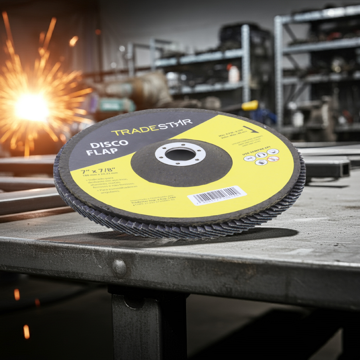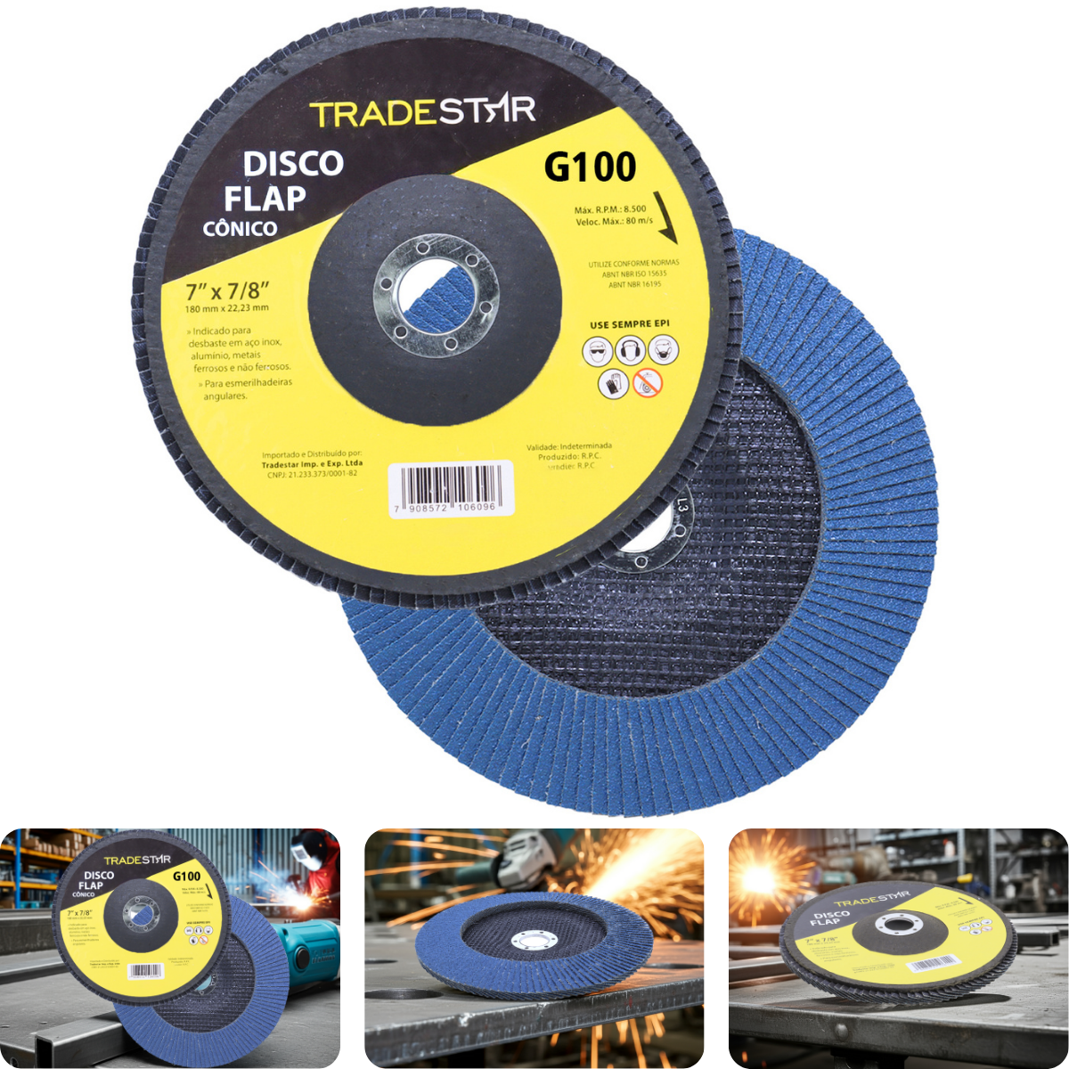 Disco de Desbaste 180 mm G100 Fibra Cônico Azul Aço e Inox TradestarO Disco de Desbaste Cônico Tradestar 180 mm G100 Azul é a escolha perfeita para quem busca eficiência, durabilidade e resultados de alta qualidade em trabalhos com metais. Projetado para atender tanto profissionais do setor industrial quanto usuários que realizam projetos domésticos ou de manutenção, este disco flap é indispensável em oficinas mecânicas, serralherias, indústrias metalúrgicas e serviços de reparo em geral.Produzido com abrasivo de óxido de alumínio, o disco oferece um desbaste mais agressivo, ideal para a remoção de material em maior volume, preparação de superfícies e eliminação de imperfeições. A versão cônica é especialmente recomendada para alcançar áreas de difícil acesso, proporcionando um acabamento uniforme mesmo em superfícies curvas, cantos ou locais estreitos.Graças ao seu design flap, o Disco Tradestar proporciona um lixamento contínuo e uniforme, reduzindo marcas e arranhões na superfície. Isso se traduz em menos retrabalho e em um acabamento mais preciso, seja em trabalhos de preparação para soldagem, remoção de rebarbas, limpeza de cordões de solda ou nivelamento de peças metálicas. Seja para uso profissional em ambientes industriais ou para projetos DIY que demandam precisão, o Disco de Desbaste 180 mm G100 Fibra Cônico Azul Tradestar é a solução confiável para garantir produtividade e resultados superiores em cada aplicação.Especificações- Abrasivo: Óxido de alumínio- Grão: G100- Dimensões: 180 mm- Diâmetro do furo: 22,23 mm- Rotação máxima: 8.500 RPM- Velocidade máxima: 80 m/s- Suporte: Fibra de vidro de alta resistência- Indicação de uso: Desbaste e acabamento de aço carbono e aço inoxidávelItens inclusos- 1 Flap Disc 180 mm G100 Fibra Conico Azul Aço E InoxGarantia- 03 meses com o Fabricante