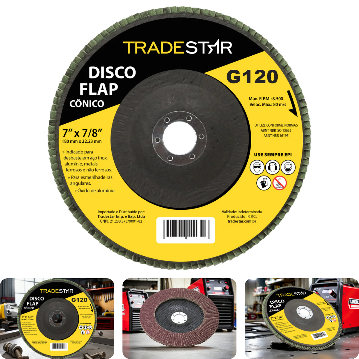 Disco de Desbaste 180 mm G120 Tradestar Fibra Cônico AçoO Disco de Desbaste Cônico Tradestar 180 mm G120 é a ferramenta ideal para profissionais que buscam precisão, durabilidade e acabamento superior em trabalhos com metais e outras superfícies. Fabricado com abrasivo de óxido de alumínio em grão 100 e suporte em fibra de alta resistência, este disco oferece desempenho confiável mesmo em condições exigentes, garantindo eficiência em cada operação.Seu formato cônico proporciona acesso a áreas de difícil alcance, permitindo acabamento uniforme em superfícies curvas e reentrantes, algo que discos planos não conseguem oferecer. Com diâmetro de 180 mm o disco se adapta facilmente a lixadeiras angulares padrão, oferecendo estabilidade, controle e segurança durante o uso.O grão G120 permite lixamento médio-fino, ideal para desbaste inicial, remoção de rebarbas, preparação de superfícies e acabamento de metais ferrosos e não ferrosos, bem como madeira e outros materiais. A construção robusta do disco também garante menor desgaste, maior durabilidade e rendimento prolongado, tornando-o uma escolha econômica e eficiente para uso contínuo.Com o Disco de Desbaste Cônico 180 mm G120, você obtém acabamento profissional, rapidez e confiabilidade, seja em trabalhos industriais ou em projetos DIY que exigem qualidade e precisão.Especificações- Tipo: Disco Flap Cônico- Abrasivo: Óxido de alumínio- Grão: 100- Dimnesões: 180 mm- Diâmetro do furo: 22,23 mm- Velocidade máxima: 80 m/s- Rotação máxima: 8.500 RPM- Material: Fibra de alta resistência- Indicação de uso: Desbaste e acabamento de metais, madeira e outras superfíciesItens inclusos-  1 Flap Disc 180 mm G120 Fibra Conico Aço TradestarGarantia- 03 meses com o Fabricante